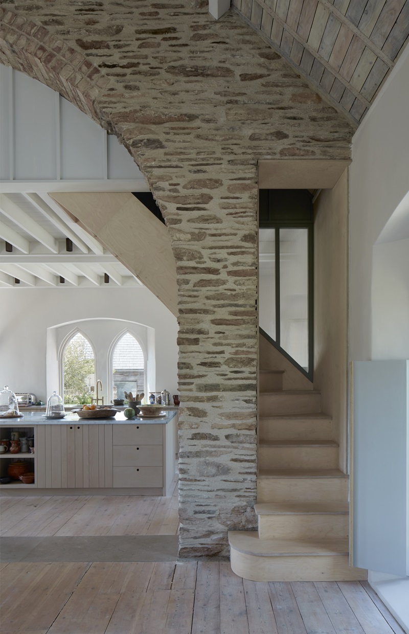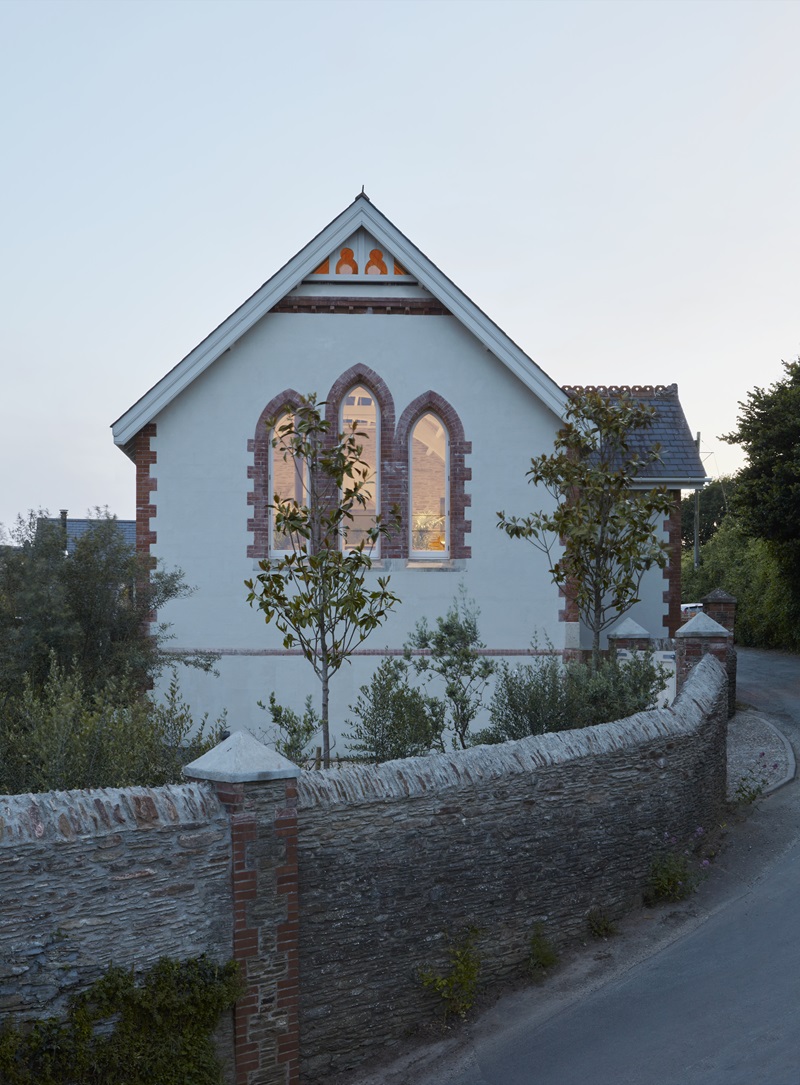 Desde la accidentada costa de un pequeño pueblo del condado de Devon, al suroeste de Inglaterra, se distingue entre los árboles el inclinado tejado de la capilla de principios del siglo XX, restaurada y convertida en vivienda por Tuckey Design Studio.