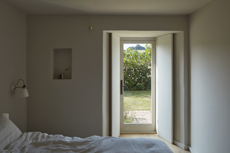 Un muro de piedra asoma en la estrecha vía rural que conduce a Old Chapel, y se detiene allí donde una valla blanca con remates en punta de lanza anuncia la entrada de la parcela. La sencilla capilla presenta una fachada de paredes blanco roto, decorada en las esquinas y los cercos de las ventanas con un ladrillo de un vivo color rojo.