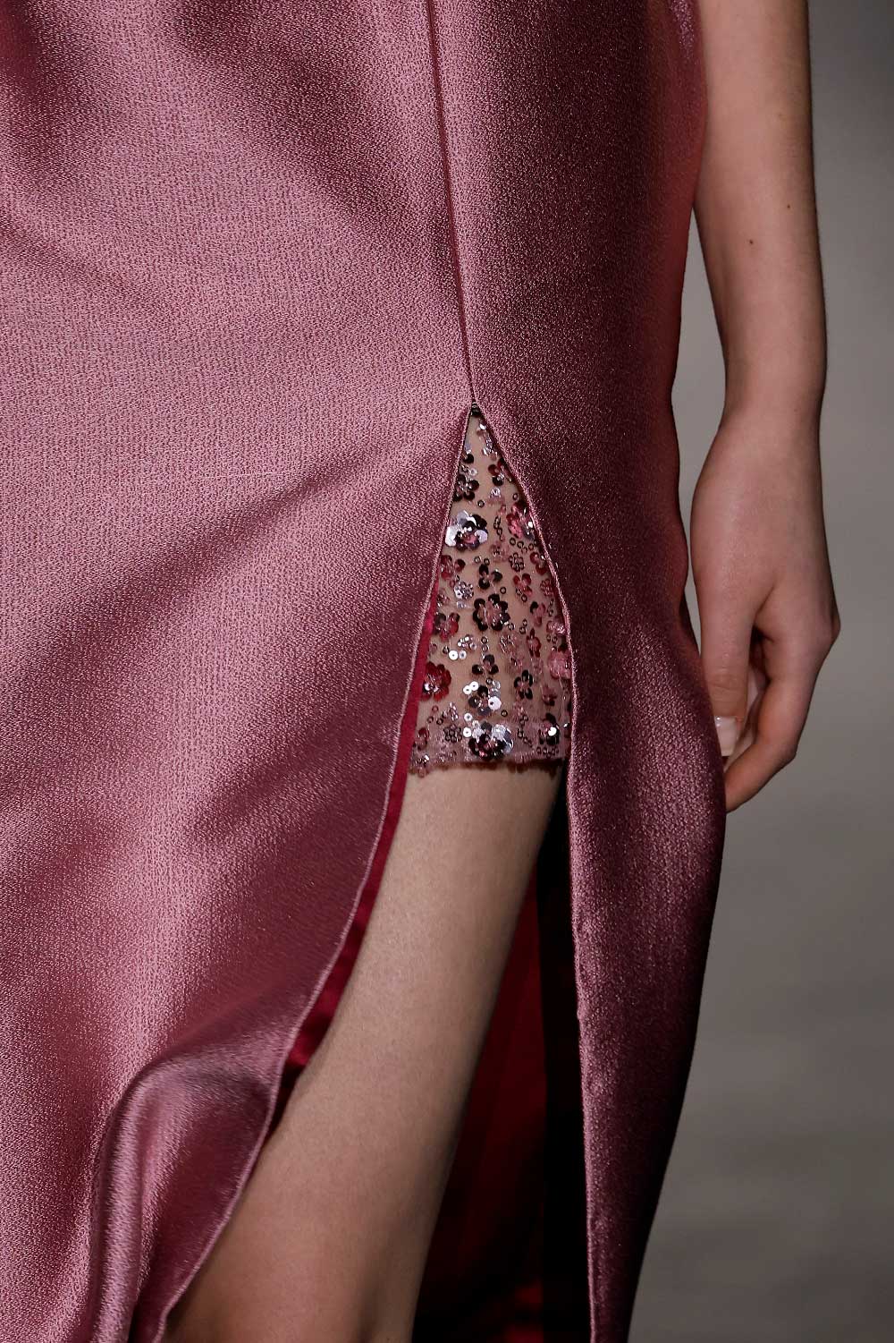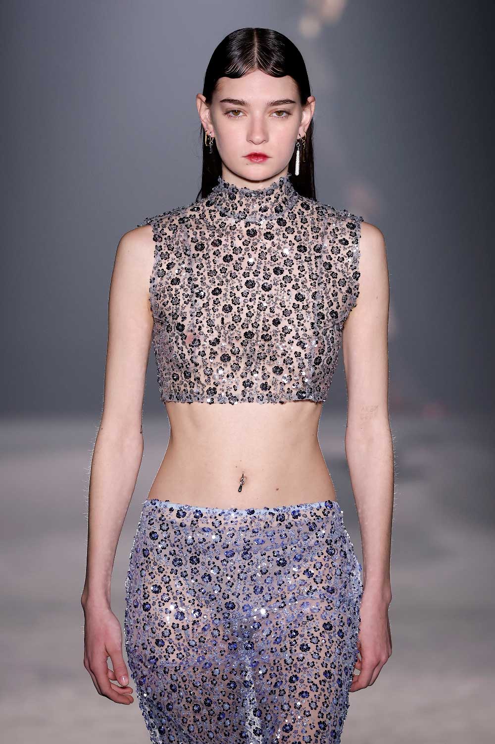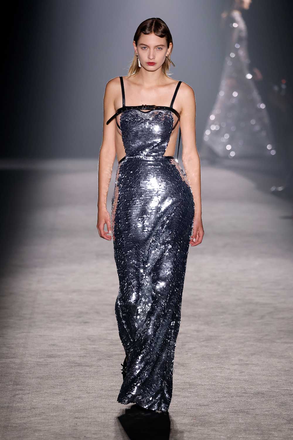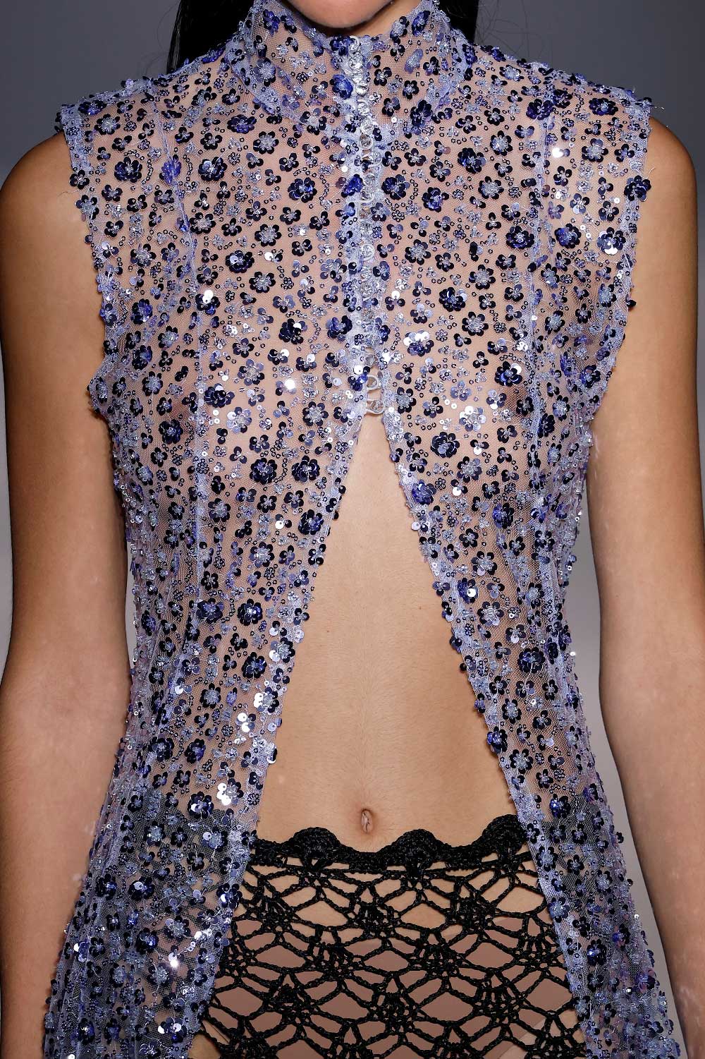 La verdad es que esa visión de la mujer poderosa es algo que nos encanta comunicar. Es por ello que en esta colección hemos intentado arriesgar con una versión más sensual. Específicamente, hemos trabajado con piezas más delicadas, como el año pasado ya introdujimos el encaje, y en 2024, habrás visto que está incluido el bordado con pedrería y paillettes. Ambos tejidos permiten un see through en las prendas, para dar ese punto más sensual.