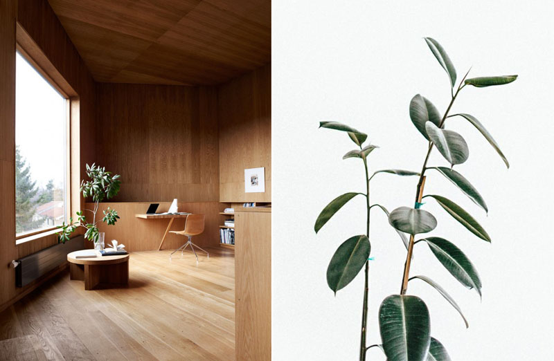 Imágenes superiores: Muy aconsejable tener luz natural y plantas en el lugar de trabajo. Izquierda: Danish Summer Kouse de Wienberg architects. Derecha: un Ficus Robusta, una planta bonita y resistente para interiores y climas mediterráneos.
