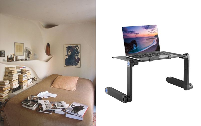 La Bienal Internacional de Diseño Saint-Etienne del año 2017 estaba dedicada al trabajo. Allí se hablaba de los nuevos lugares de trabajo como es la cama. No es ninguna tontería usar la cama cómo despacho. Los laptops y soportes regulables como esta Mesa Tumdem pueden hacerte el trabajo mas placentero. Muy recomendable, si por ejemplo, tienes sillas poco ergonómicas en las que no aguantarás más de una hora. Es recomendable cambiar de lugar y de posición. En algunas oficinas se recomienda trabajar de pie, por temas de salud, algunas horas al día, esto se hace elevando el ordenador con soportes regulables como este Tumdem