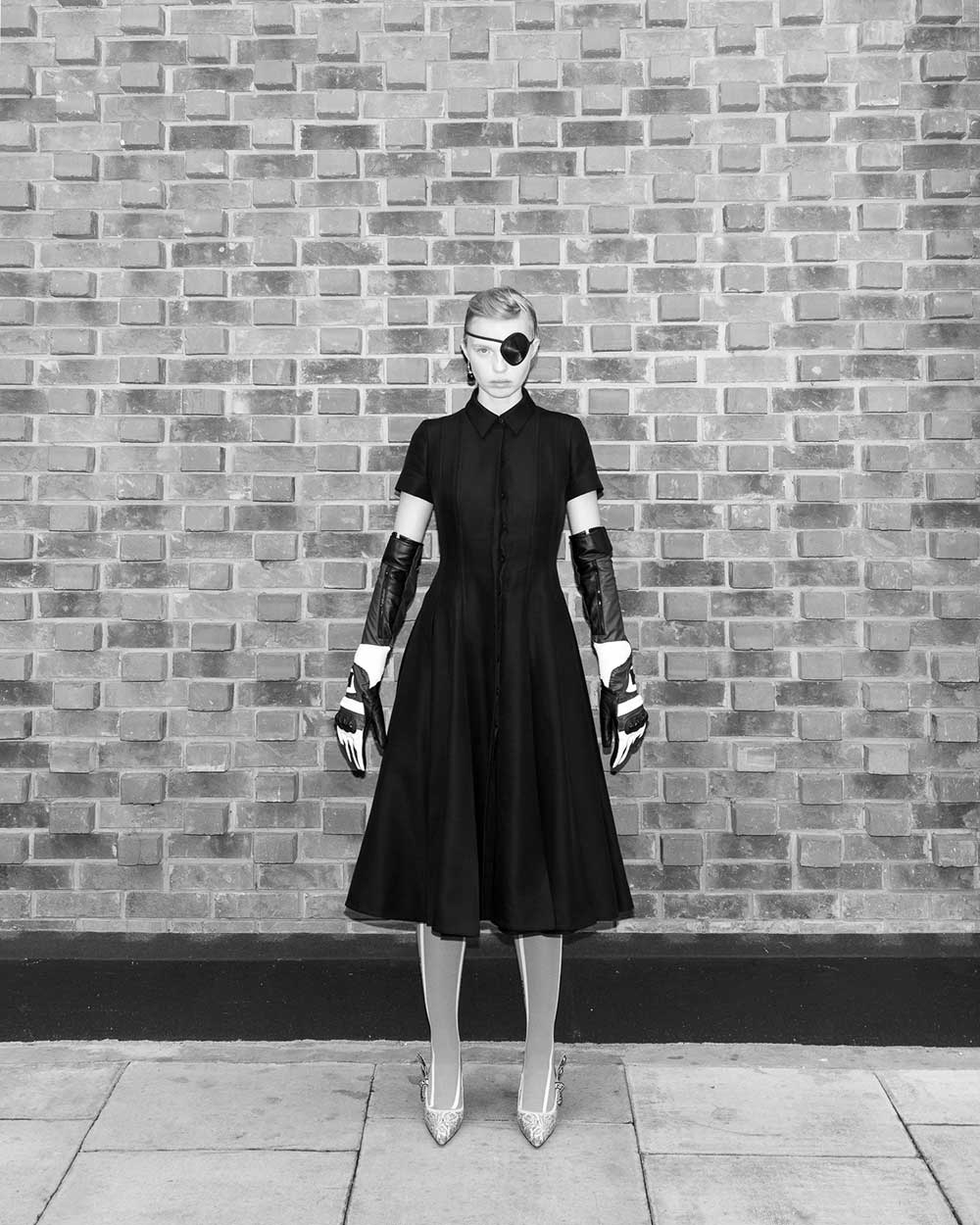 Vestido, guantes, medias y zapatos DIOR + Pendiente JUSTJJJEWELLERY + Parche en el ojo del estilista