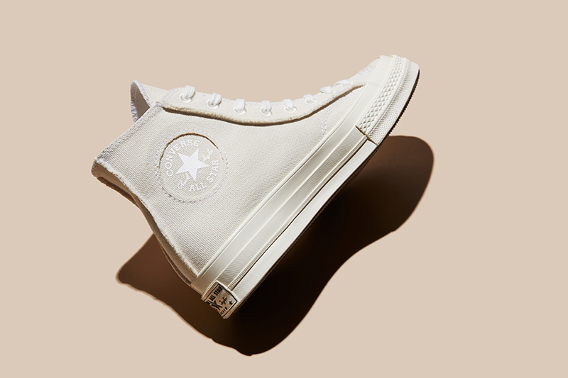 El nuevo modelo Renew Tri-Panel Chuck 70 se viste de paneles de colores en tonos arena, melón, gris noble y rosa suave, creado con una mezcla de 80% algodón virgen y un 20% de algodón reciclado. Además, una de las nuevas zapatillas Converse Chuck 70 Renew se presenta en color natural gracias a una mezcla de hilos sin teñir que forman la tela de la parte superior de lona de la zapatilla. Este modelo está fabricado a partir de un 60% de materiales reciclados y apenas un 40% de algodón virgen.