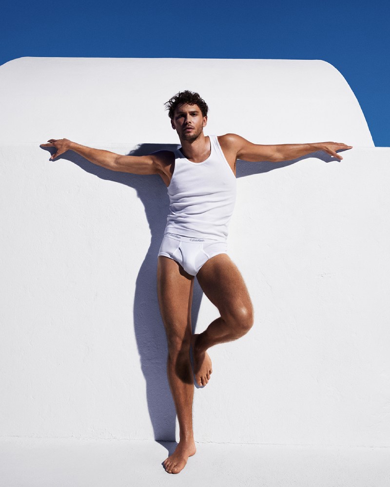 En las imágenes, vemos a Cooper Koch modelando los colores más icónicos del repertorio CK: blanco, negro y gris jaspeado. Estos, si nos preguntas a nosotros, son los mejores para replicar el look con la banda elástica visible. Sobre esto, lleva una tank de algodón súper simple… o no.
