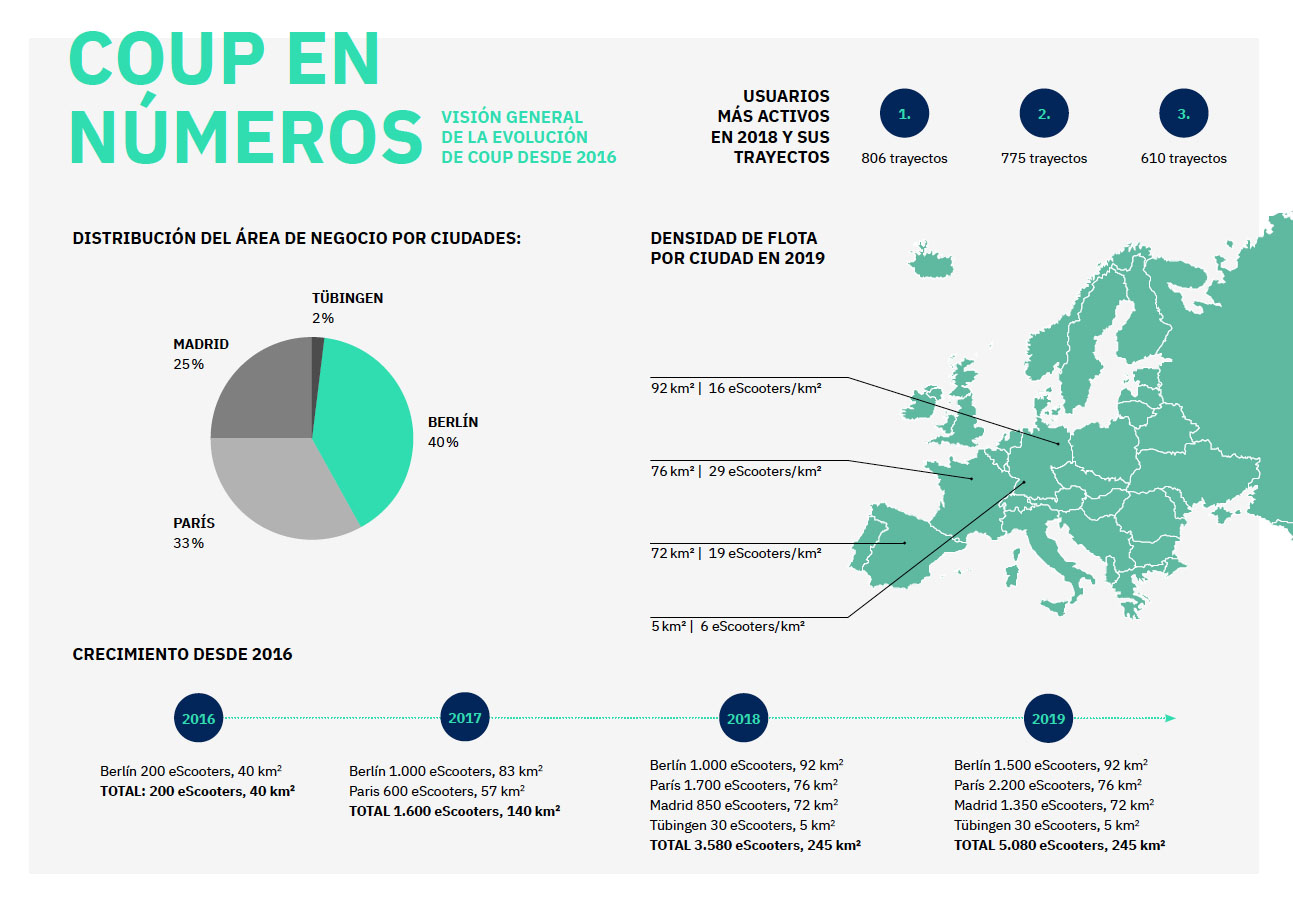 Coup, el servicio de scooters eléctricas compartidas, comenzó en Berlín en agosto de 2016 con solo 200 vehículos. La expansión de la compañía continuó con el lanzamiento de 600 unidades en París en el verano de 2017. Desde entonces, Coup ha continuado ampliando su zona operativa, ha aumentado significativamente el número de scooters disponibles en ambas ciudades (alcanzando las 1000 en Berlín y 1.700 en París) y ha optimizado su app de reserva y desbloqueo de scooters.