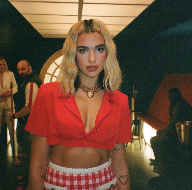 Dua Lipa con una americana cropped de manga corta via @dualipa