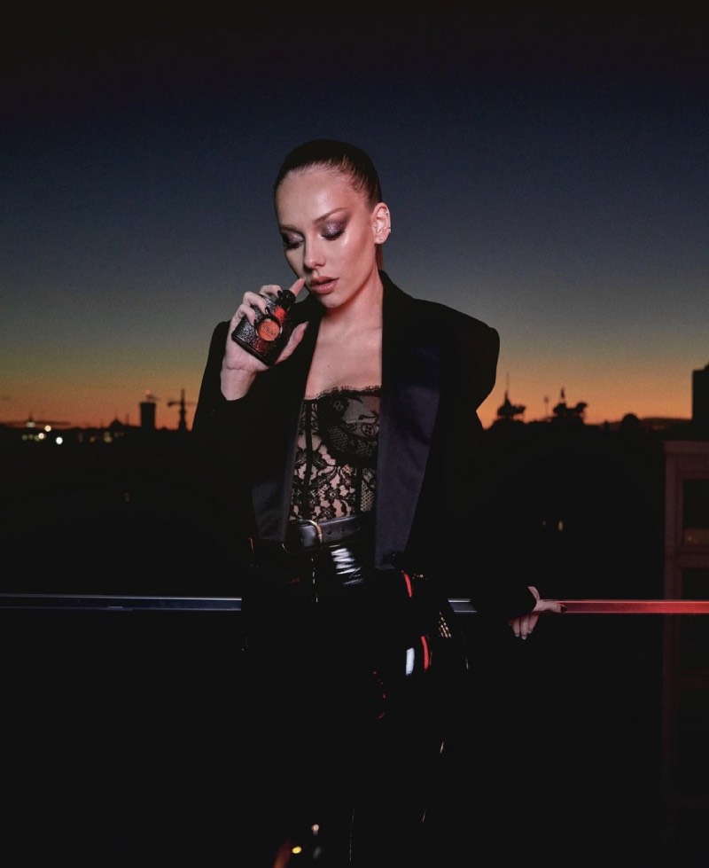 Ester Expósito para YSL con una americana cropped negra de cuello satinado via @ester_exposito