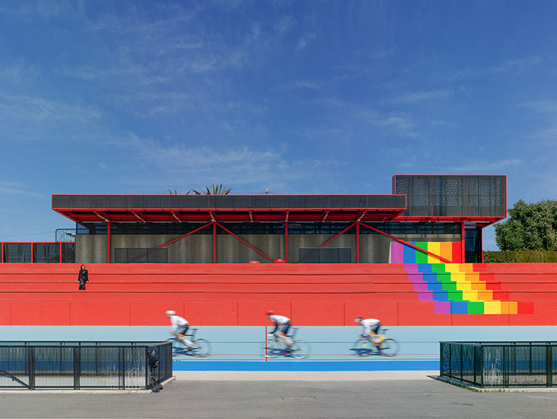 El velódromo se plantea como una pieza de origami que Crystalzoo decide pintar de color rojo que va plegándose sobre la pista dando lugar a las gradas.