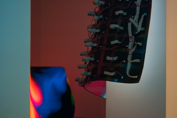 Daniel Canogar: Me interesa mucho esta noción del espacio activo. Me interesa que el espectador se ponga en movimiento y tenga una relación más física con lo que está contemplando. Tendemos a pensar que nuestro aprendizaje es fundamentalmente óptico pero me interesa mucho esta noción de aprendizaje y conocimiento físico de nuestro entorno. Por eso hago pantallas tridimensionales escultóricas, pantallas que inviten al espectador a levantar el culo del sofá y empezar a ver la obra desde distintos ángulos. Creo que el conocimiento háptico del espacio y del tiempo, del entorno, es fundamental para navegar en estos espacios tan sintéticos y tecnológicos.