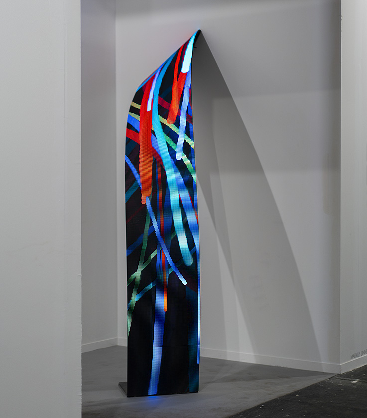 Daniel Canogar: La verdad es que siempre he creído que hay una relación muy cercana entre el arte y la tecnología. No creo que estemos en un punto muy diferente al que había hace 500 años por poner un ejemplo. En el Renacimiento había una relación muy estrecha entre la mirada científica y la mirada artística, de hecho casi no había distinción entre una y la otra. También es verdad que ahora estamos ante un cambio de paradigma muy fuerte, que hace que algunos artistas estemos preocupados en reflejar nuestro tiempo y le prestemos a la tecnología especial atención. Como suele suceder el mercado del arte están recibiendo esto con retraso, pero bueno yo detecto mucho el interés de los espectadores por los temas que se suscitan en el arte tecnológico, incluso por parte de un publico digamos general.