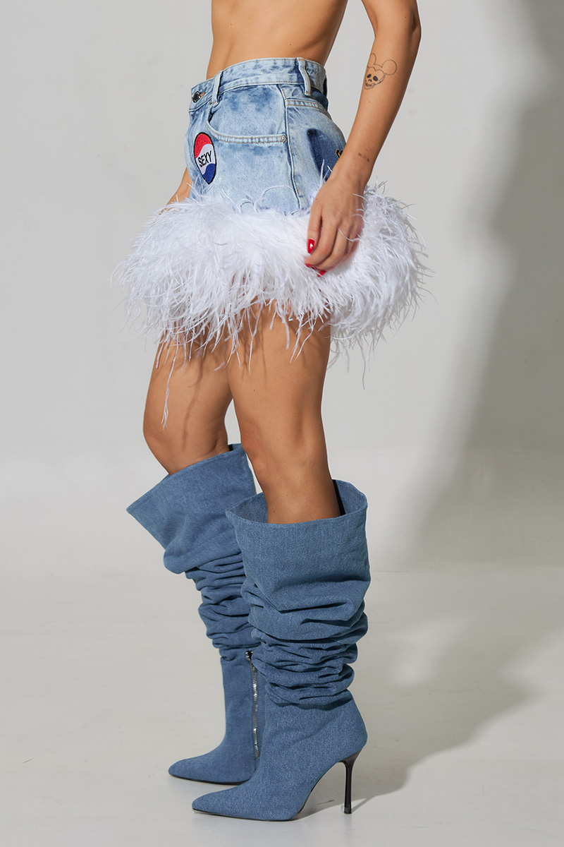 Por no hablar de las faldas vaqueras, que son flipantes. También con plumas de avestruz, han encontrado la manera de hacer esa falda que tienes en el armario y no usas tu look de fiesta predilecto. Un look Y2K digno de tu adolescente más rebelde.