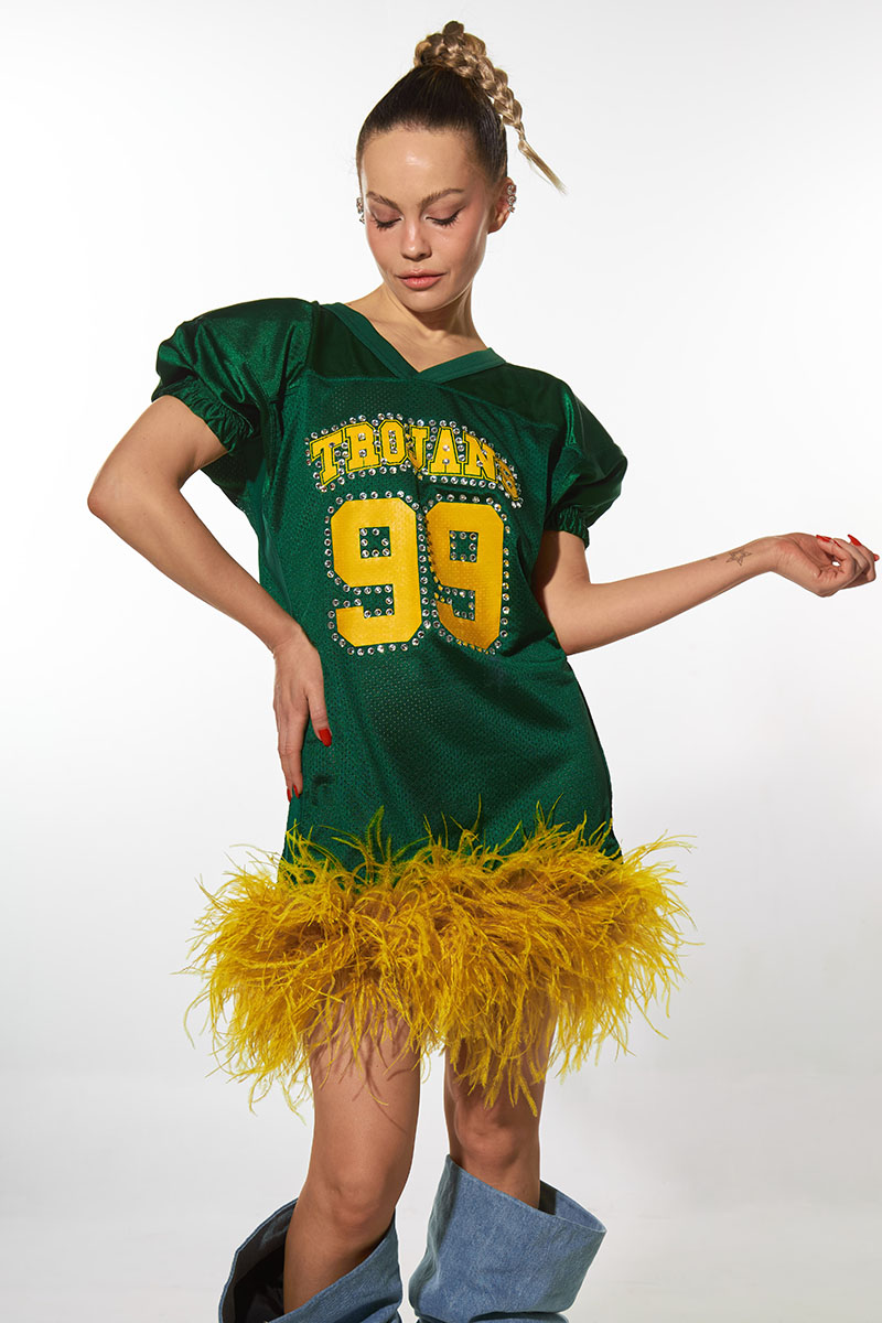 ¿Podemos hablar de esta fantasía? La típica camiseta de fútbol americano que llevaba tu crush de Disney Channel pero con un rollo girly muy conseguido gracias a los brillantitos y las plumas.