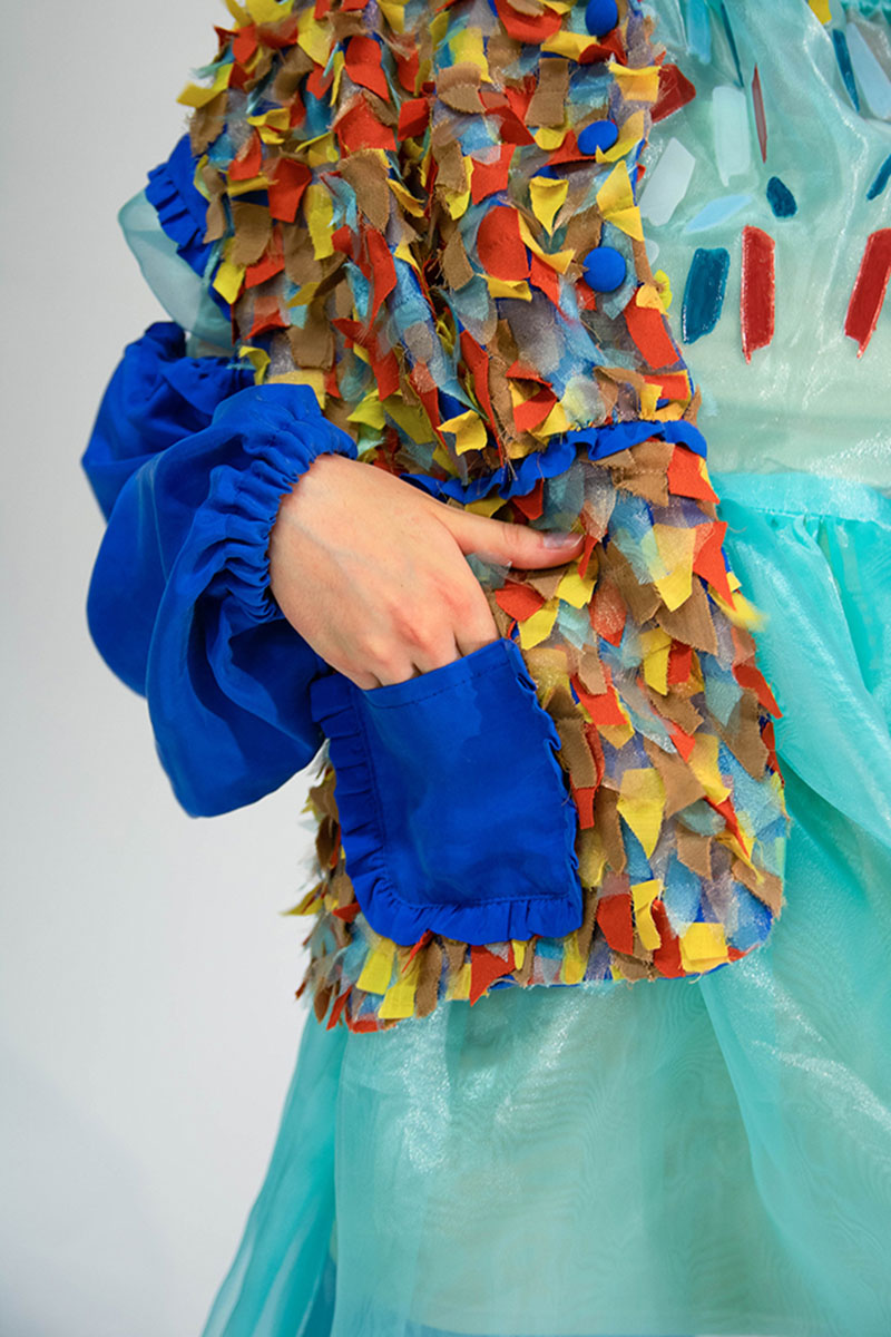 Desde el primer hasta el último look, Ester muestra la transición de una persona desde la estabilidad mental hasta el desbordamiento de los sentimientos materializándolo a través de tejidos que van desde la lana (estabilidad) a la organza y el milú (debordamiento).