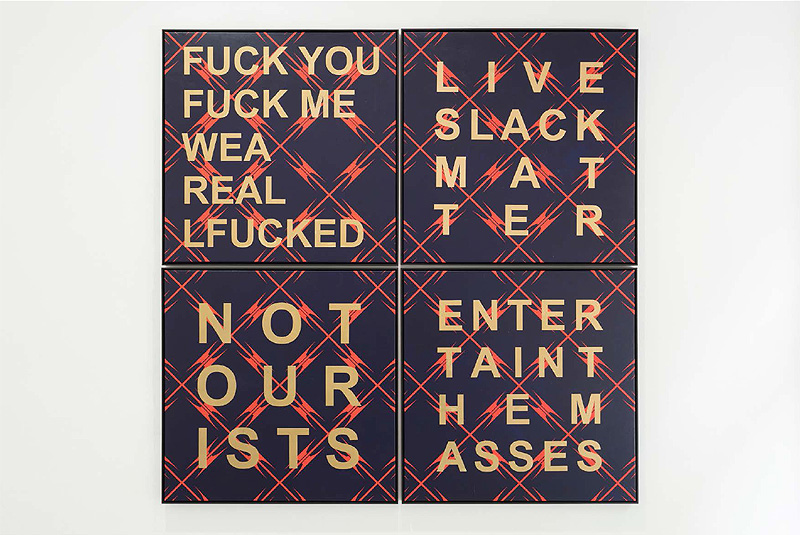 El trabajo de Kendell Geers se sitúa entre la tradición y la contemporaneidad: un sudafricano establecido en Bélgica que está al mismo tiempo tan profundamente influenciado por el poderoso legado del arte tradicional africano como por los movimientos de vanguardia europeos, desde Dadá y el surrealismo hasta el punk y la Internacional Situacionista.