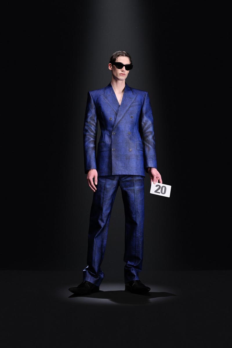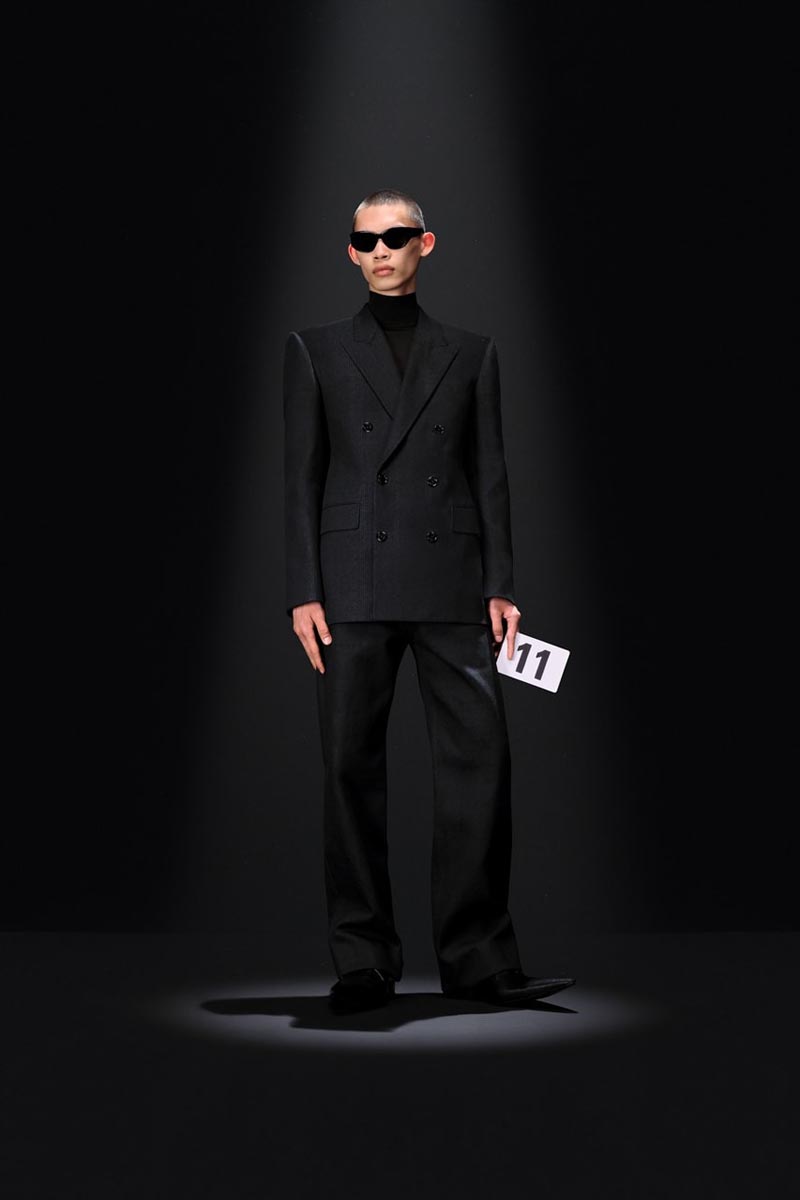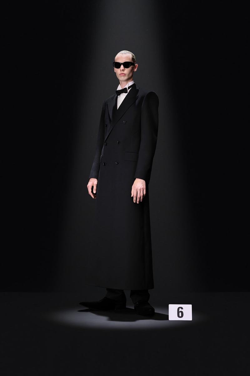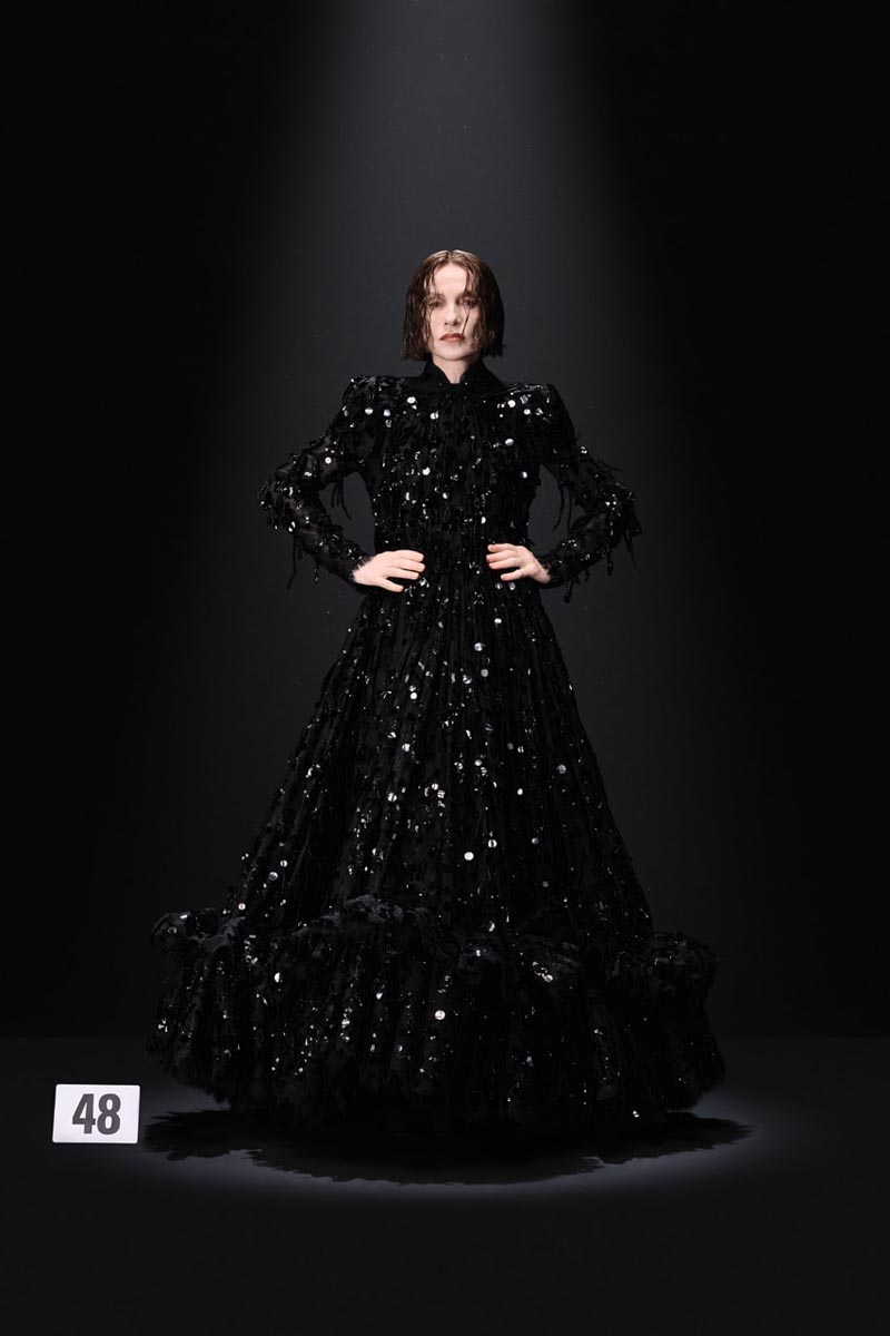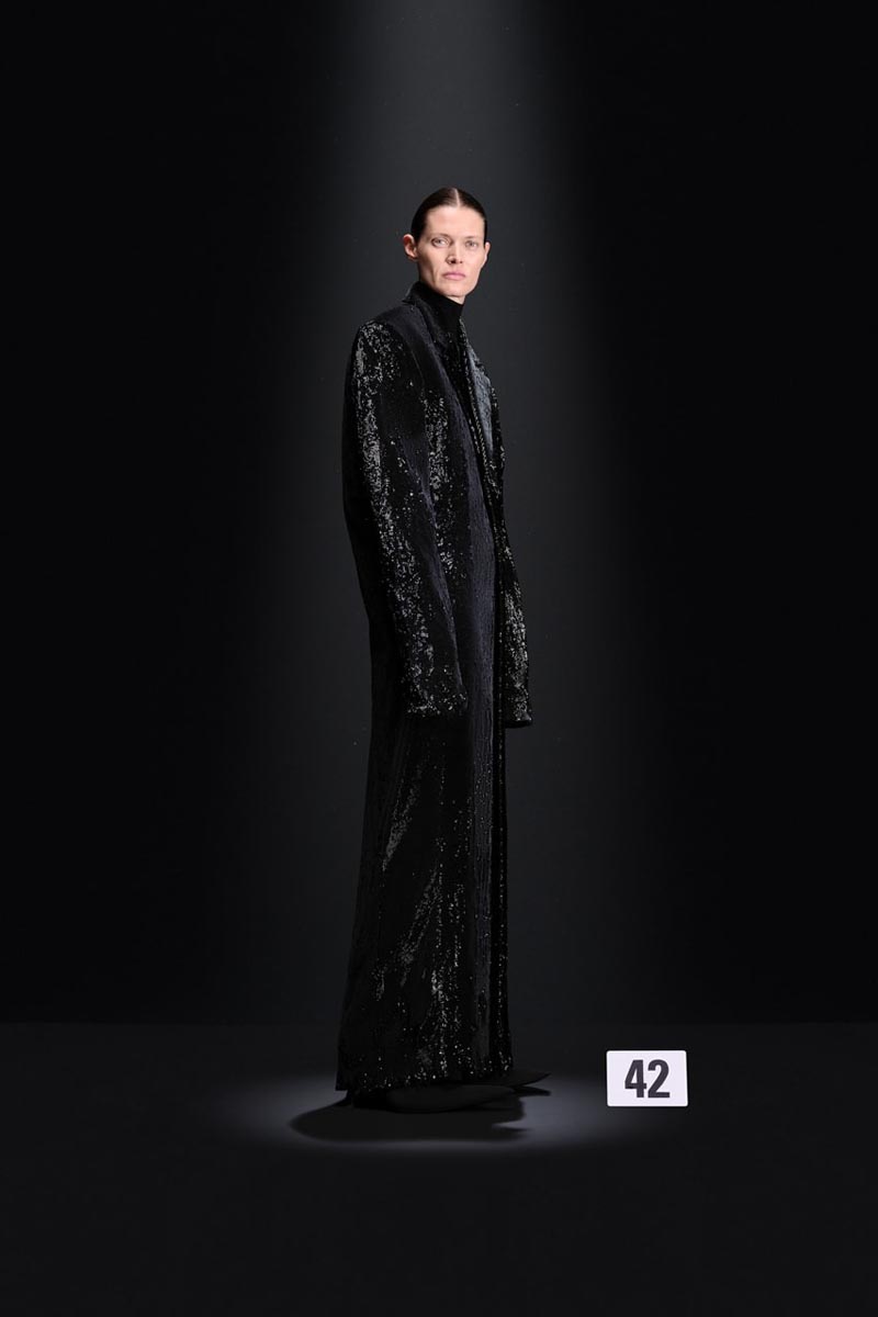 Balenciaga Couture 52 comenzó con un vestido de corte muy clásico acabado en terciopelo; decorado con perlas, este modelito negro abrió un rio de looks femeninos con un cuello de pico resaltado gracias a la construcción rígida de hombros exagerados en chaquetas y vestidos. Esta construcción se fue desarrollando y exagerando más con cada ensemble femenino. Al mismo tiempo, propuestas de sastrería estilo Demna componían los looks masculinos. Trajes con efecto trampantojo destacaron frente a tanto negro y gris; la silueta hourglass también hizo su primera aparición en americanas masculinas aquí.