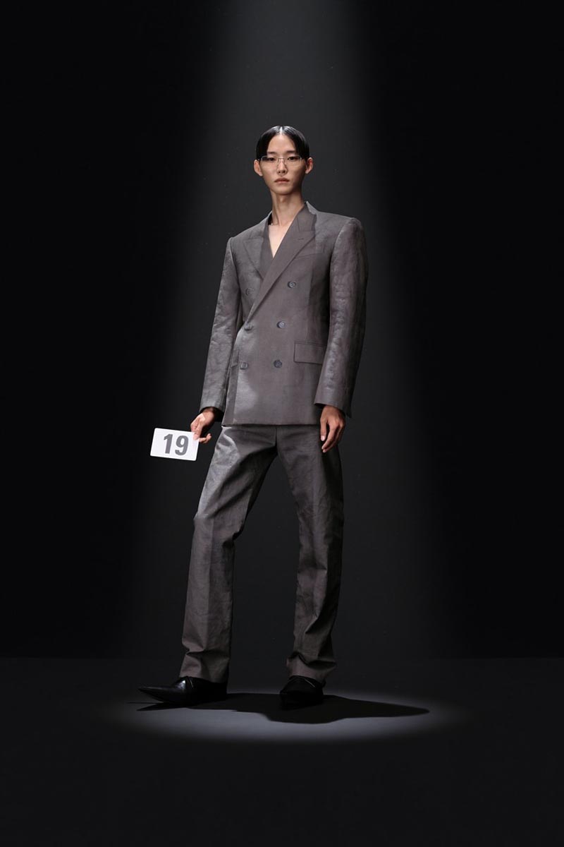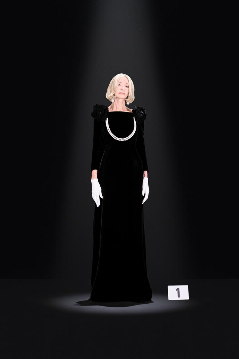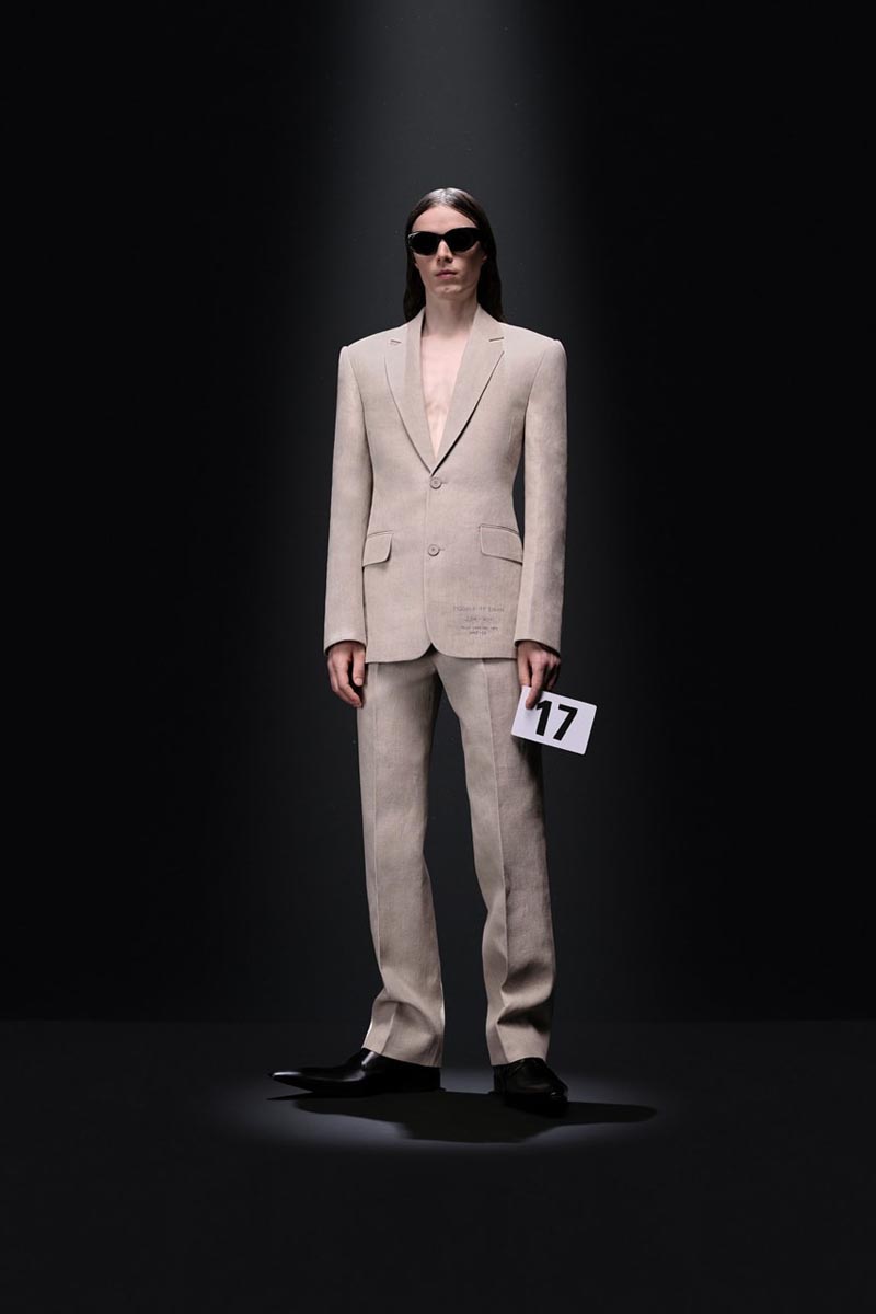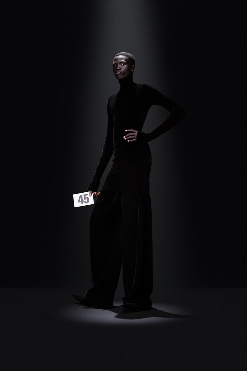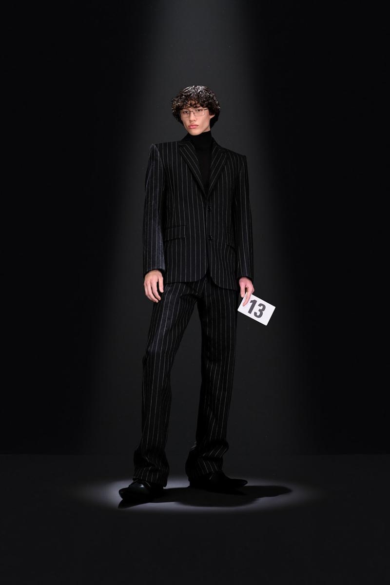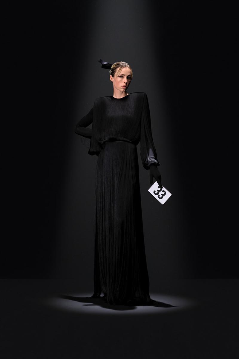 Balenciaga Couture 52 comenzó con un vestido de corte muy clásico acabado en terciopelo; decorado con perlas, este modelito negro abrió un rio de looks femeninos con un cuello de pico resaltado gracias a la construcción rígida de hombros exagerados en chaquetas y vestidos. Esta construcción se fue desarrollando y exagerando más con cada ensemble femenino. Al mismo tiempo, propuestas de sastrería estilo Demna componían los looks masculinos. Trajes con efecto trampantojo destacaron frente a tanto negro y gris; la silueta hourglass también hizo su primera aparición en americanas masculinas aquí.