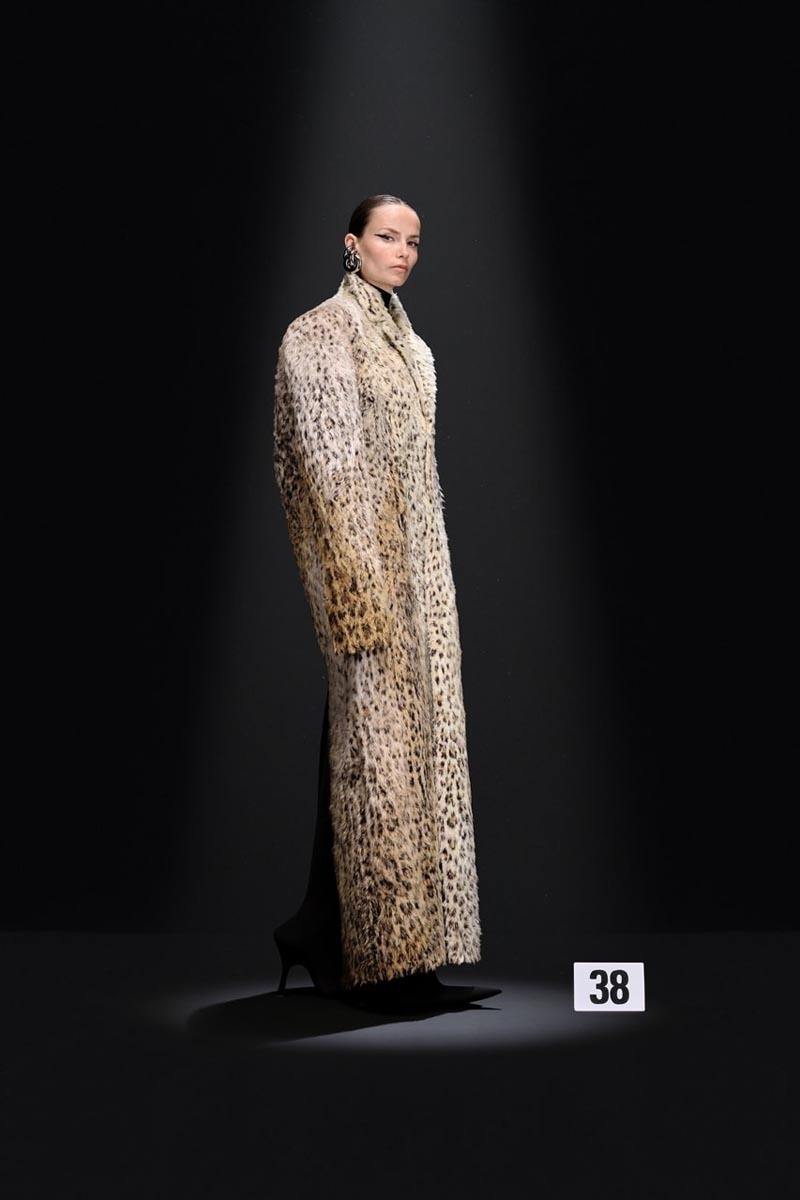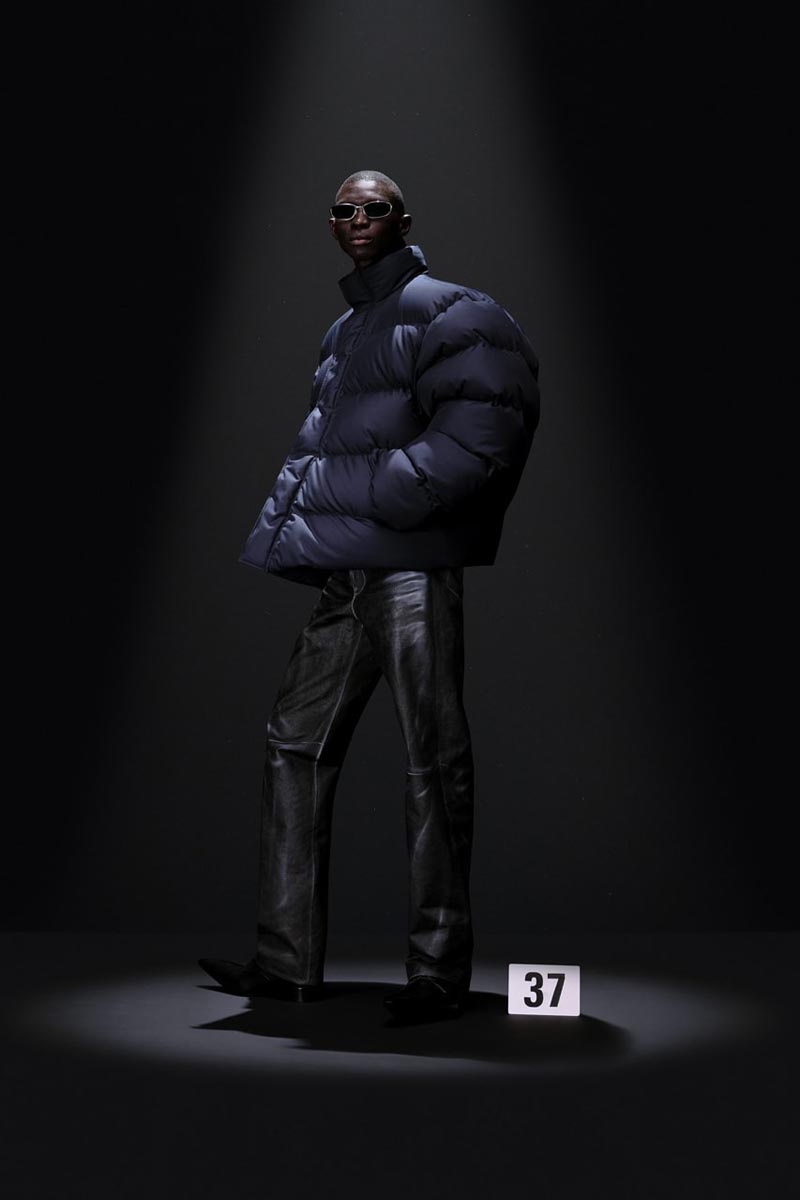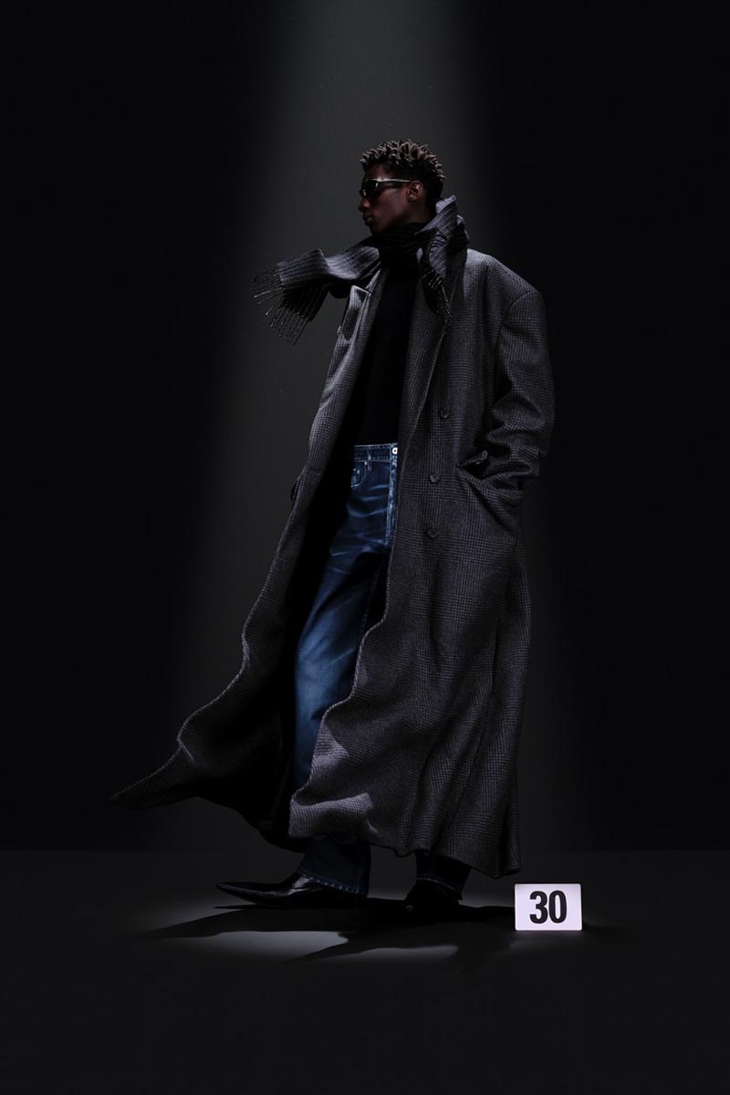 Dos abrigos oversized de faux fur sirvieron como punto de transición a la parte más urbana de la colección. Vaqueros y truckers, propios de un armario street, se elevaron con proporciones oversized pulcramente ejecutadas. El efecto de movimiento, logrado gracias a estructuras metálicas internas, hizo un regreso este año en las bufandas y abrigos de sastre que parecían azotadas por el viento y congeladas en el tiempo. No todo fue teatralidad; prendas clásicas del abrigo contemporáneo se reimaginaban con las proporciones exageradas que tanto amamos: abrigos de sastre en infinidad de acabados y un trench en piel. A su vez, vestidos con la silueta de cuerpo completo clásicos de Demna se colaban ocasionalmente. Un abrigo puffer acolochado de proporciones exageradas y dos cortavientos de estilo cocoon que mezclaban el nuevo y el antiguo Balenciaga fueron los highlights de la propuesta haute street.