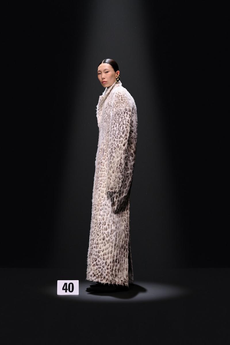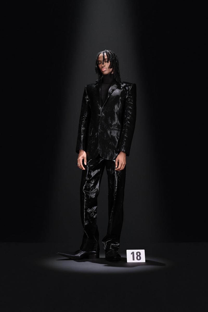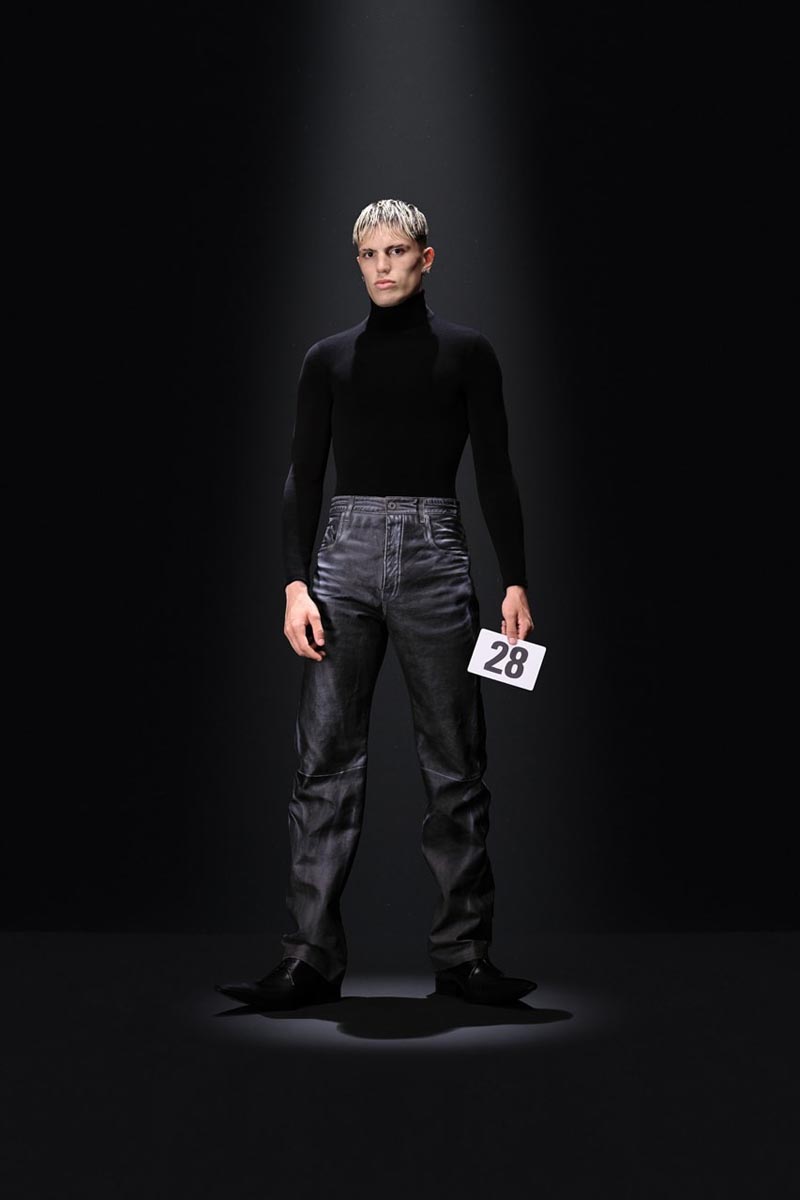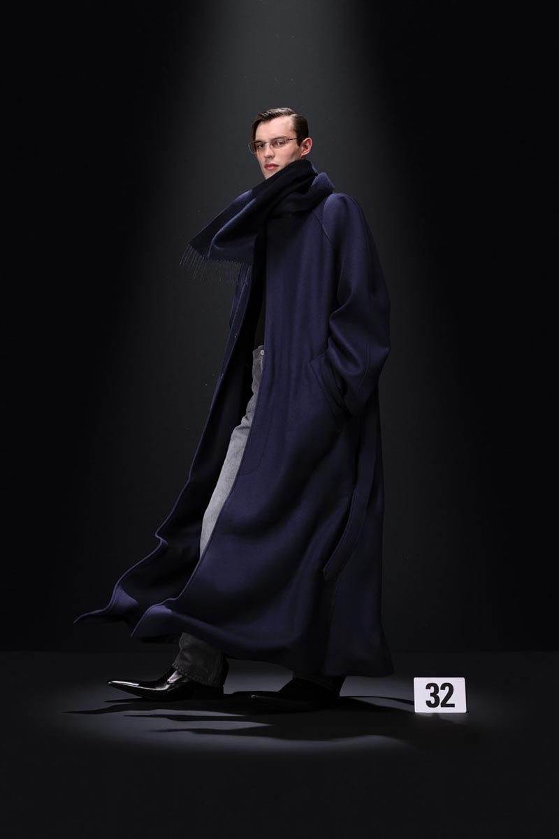 Dos abrigos oversized de faux fur sirvieron como punto de transición a la parte más urbana de la colección. Vaqueros y truckers, propios de un armario street, se elevaron con proporciones oversized pulcramente ejecutadas. El efecto de movimiento, logrado gracias a estructuras metálicas internas, hizo un regreso este año en las bufandas y abrigos de sastre que parecían azotadas por el viento y congeladas en el tiempo. No todo fue teatralidad; prendas clásicas del abrigo contemporáneo se reimaginaban con las proporciones exageradas que tanto amamos: abrigos de sastre en infinidad de acabados y un trench en piel. A su vez, vestidos con la silueta de cuerpo completo clásicos de Demna se colaban ocasionalmente. Un abrigo puffer acolochado de proporciones exageradas y dos cortavientos de estilo cocoon que mezclaban el nuevo y el antiguo Balenciaga fueron los highlights de la propuesta haute street.