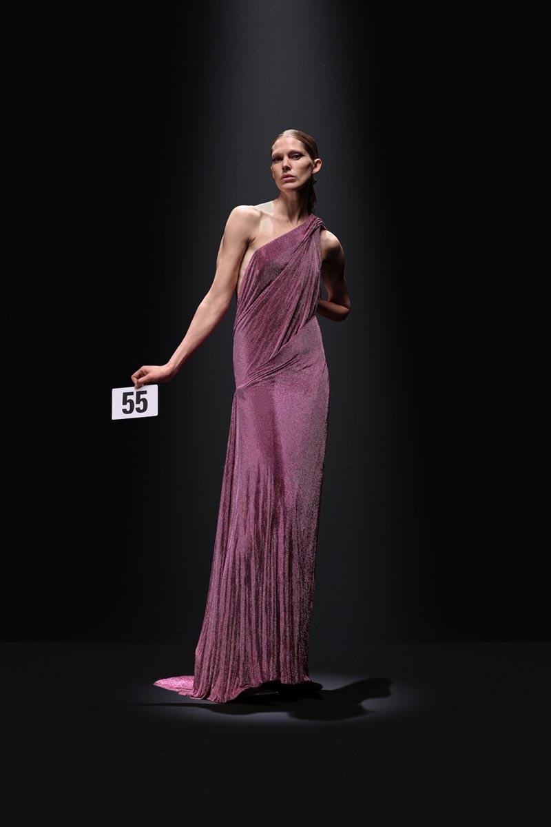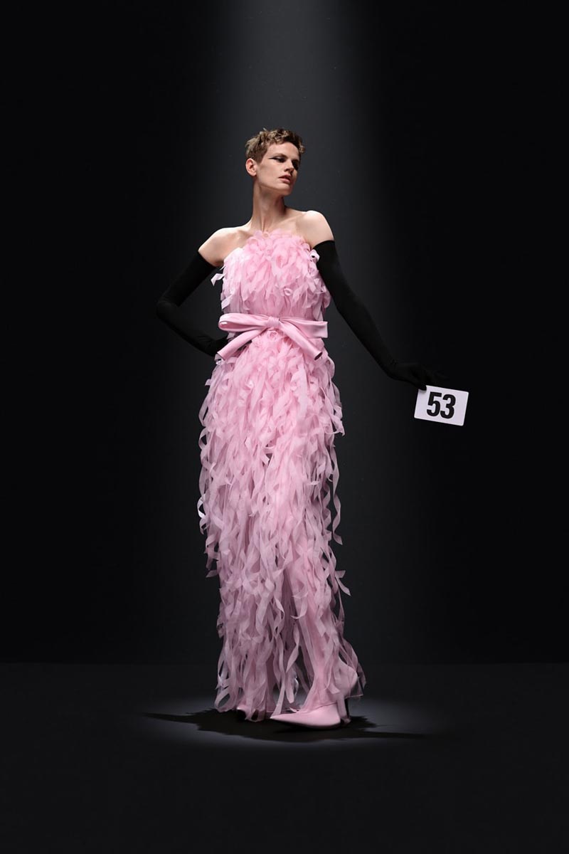 Tras dos looks de pantalones negros y jerséis de cuello vuelto en negro, Balenciaga Couture 52 se preparaba para cerrar por todo lo alto. Las piezas de eveningwear comenzaron a llegar en negro, un color muy arraigado al ADN de la maison desde tiempos de Cristóbal, donde pudimos ver ese nexo tan especial que Demna ha podido establecer entre modernidad y tradición. Siluetas clásicas (y casi sacadas de archivo) de Cristóbal se presentaron con nuevos y modernos acabados… tenemos que resaltar el look 49 con su silueta arquitectónica en tafetán de seda. Un vestido con silueta de crinolina en encaje rojo y dos vestidos de plumas desembocaron en el look 54, una creación de verdadero espectáculo presentada en fucsia (un color también muy old school de la casa). Dos vestidos túnica (derivativos del Delphos) en hilo metálico cerraban el componente delicado.