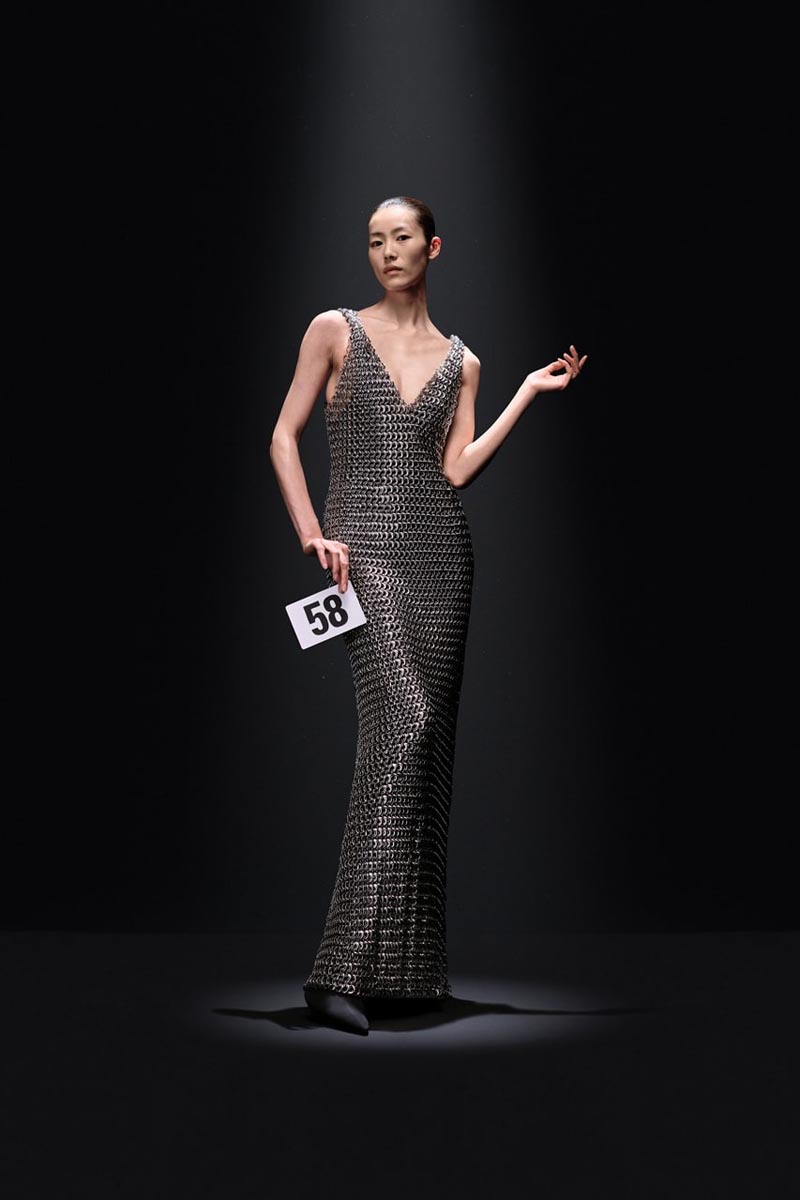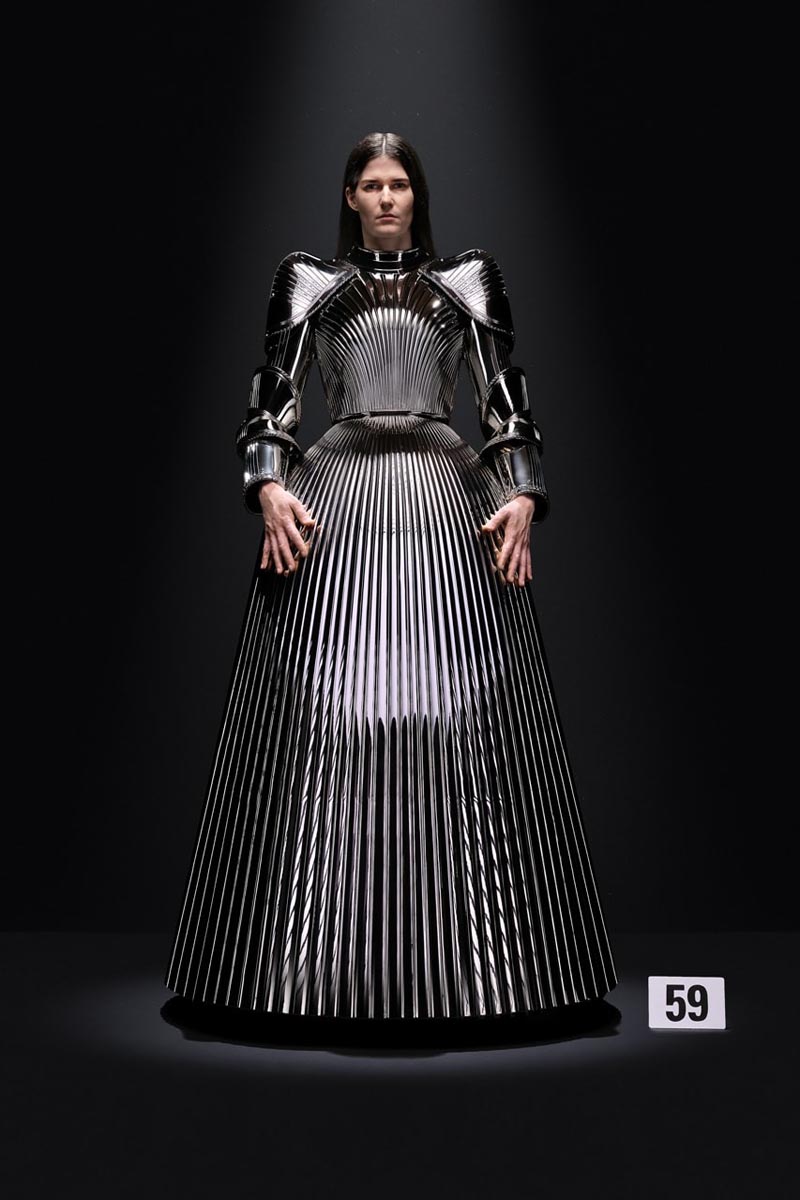 El final de Balenciaga Couture 52 no nos lo esperábamos. Retomando el tema medieval de su colección Otoño 2021, Demna presentó un vestido construido en malla metálica que se ceñía a la perfección gracias al peso de su material. El gran final vino en forma de armadura. Un look de novia como ningún otro fue lo que cerró este desfile…. construido con resina cromada, esta composición con silueta de menina española combinaba la delicadeza de la feminidad con la dureza de la armadura.