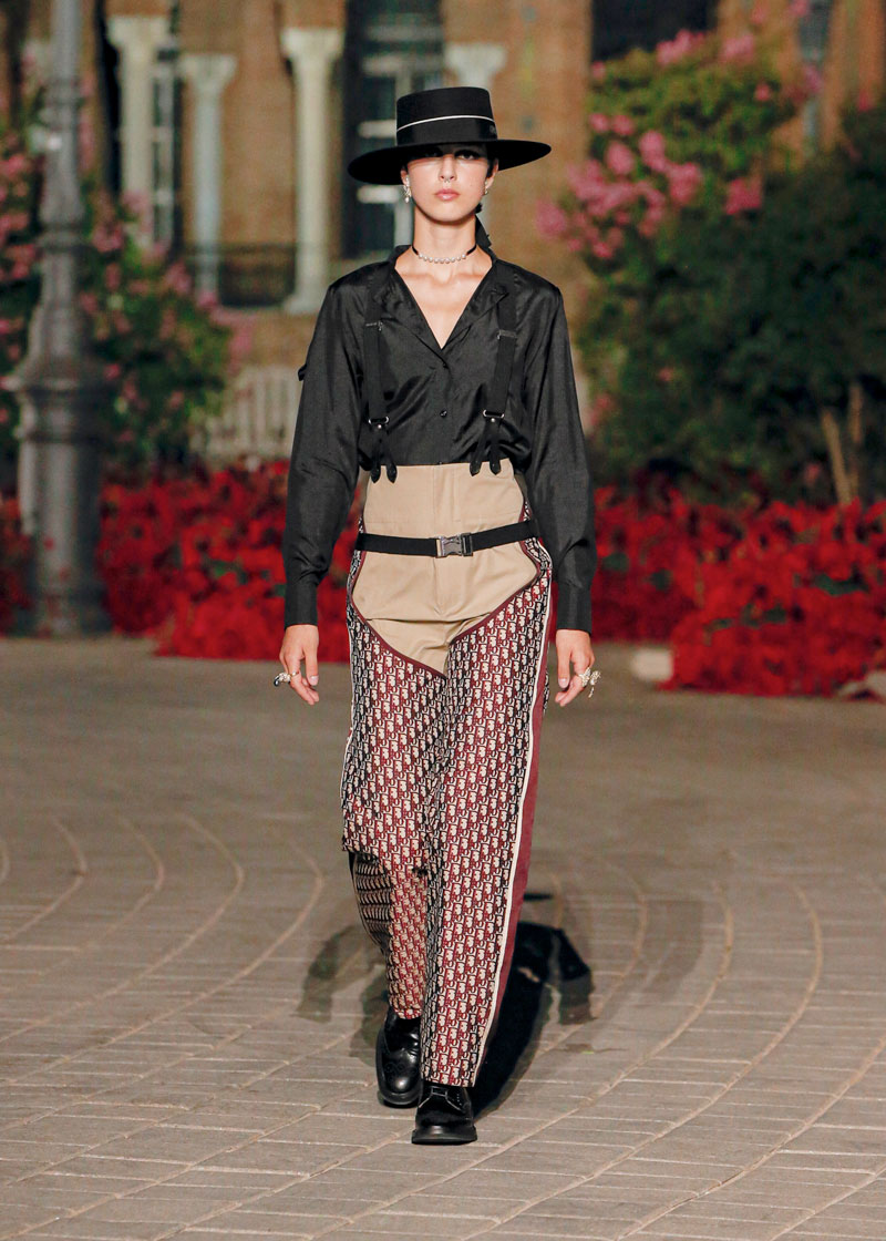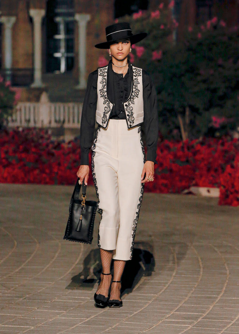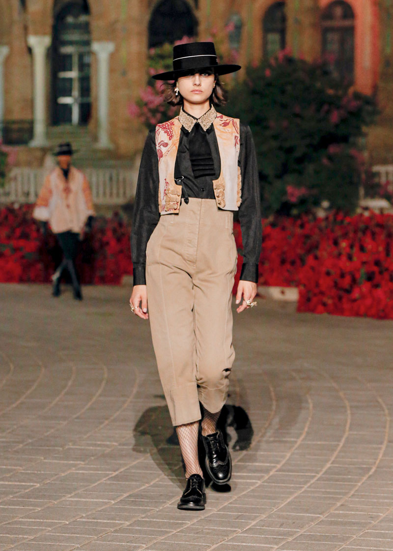 Pasando a los pantalones de la colección que vimos en el desfile de Dior en Sevilla, primaron los pantalones de pinzas de corte alto (referenciando otra vez a elementos de la sastrería clásica). Tuvimos algunos otros modelos sueltos como los ornamentados para el conjunto de inspiración torera, dos vaqueros y algunos de sastre en corte capri. Destaco también que Dior ha resucitado las perneras (conocidas como chaparreras dentro del ideario español) que se unen de una manera bastante orgánica a la temática central de la colección.