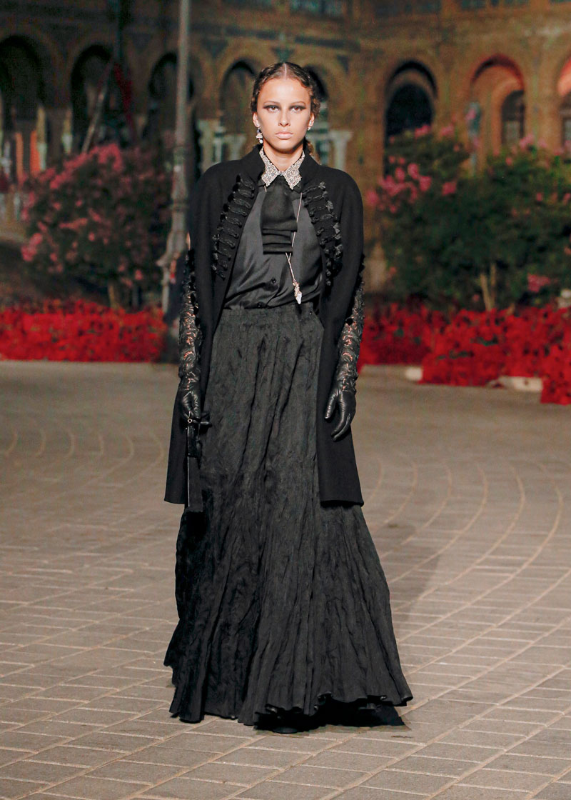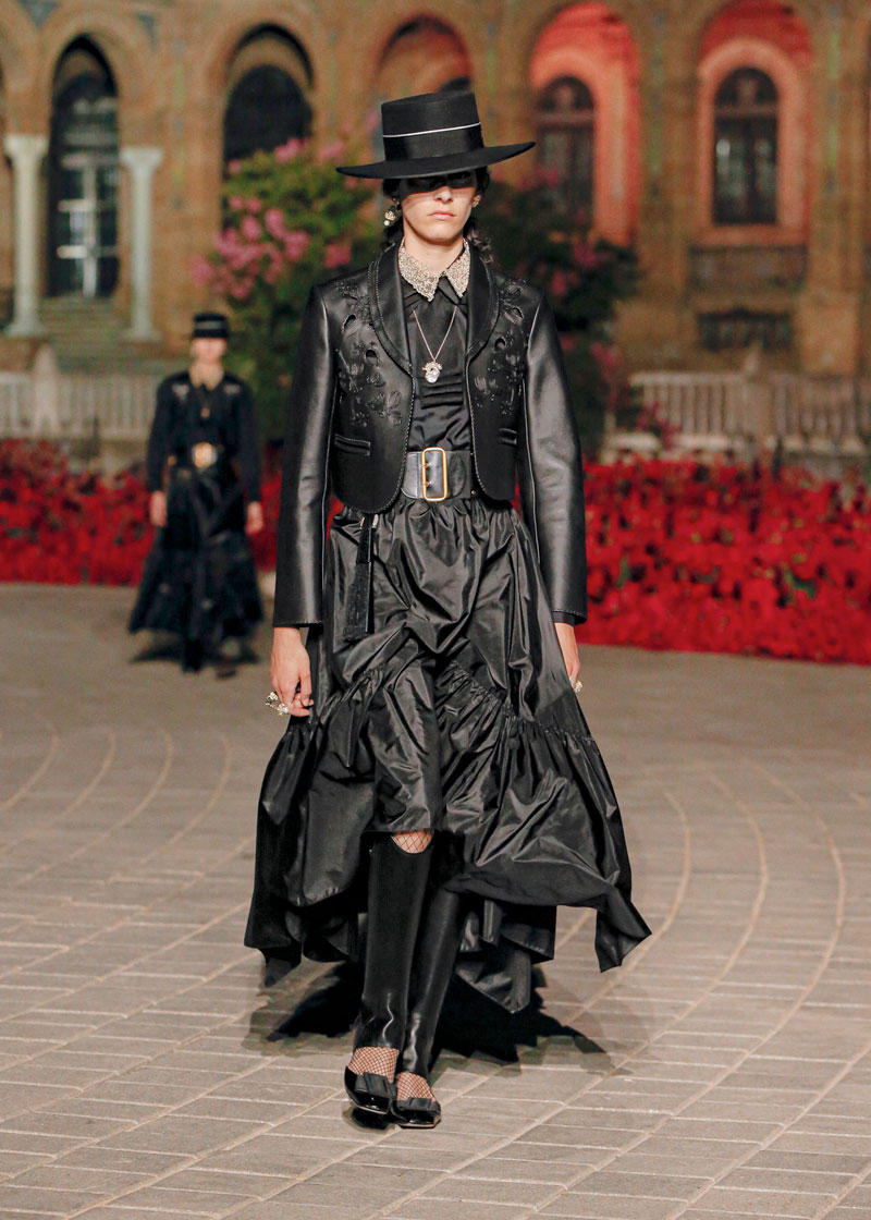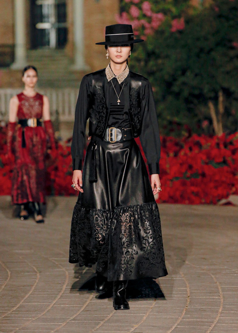 El departamento de los accesorios no ofrecía demasiadas opciones, pero si las adecuadas: el sombrero cordobés fue el gran protagonista de este discurso que vimos acompañado en varios looks de un cinturón extra ancho de piel negra (más referencia al mundo hípico). Y si nos preguntamos cuales fueron las texturas que cobraron protagonismo en el desfile de Dior en Sevilla tenemos el encaje, el satén, el terciopelo, y el satén de los espectaculares vestidos de noche.