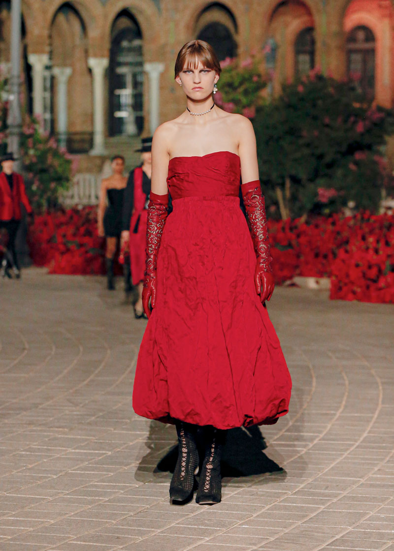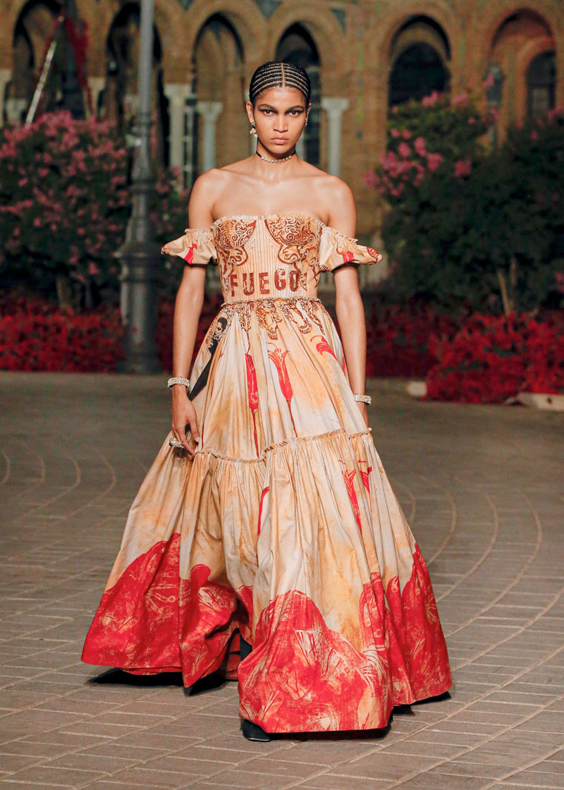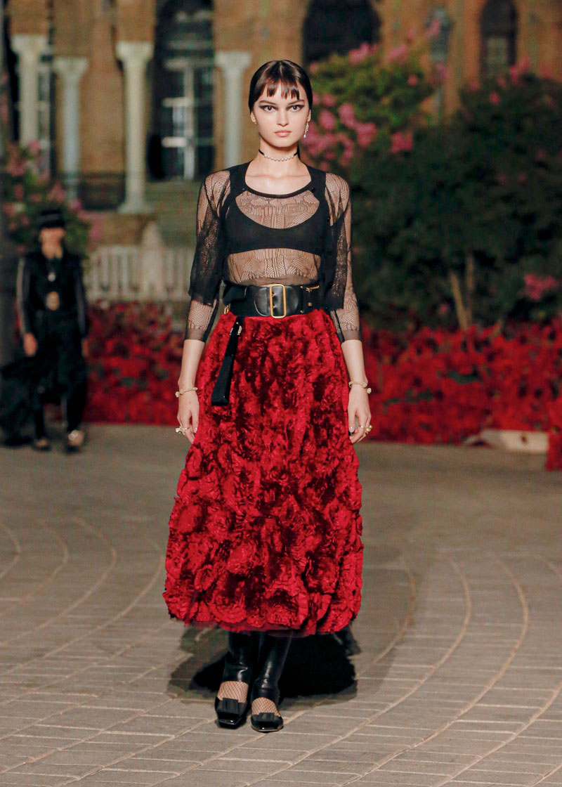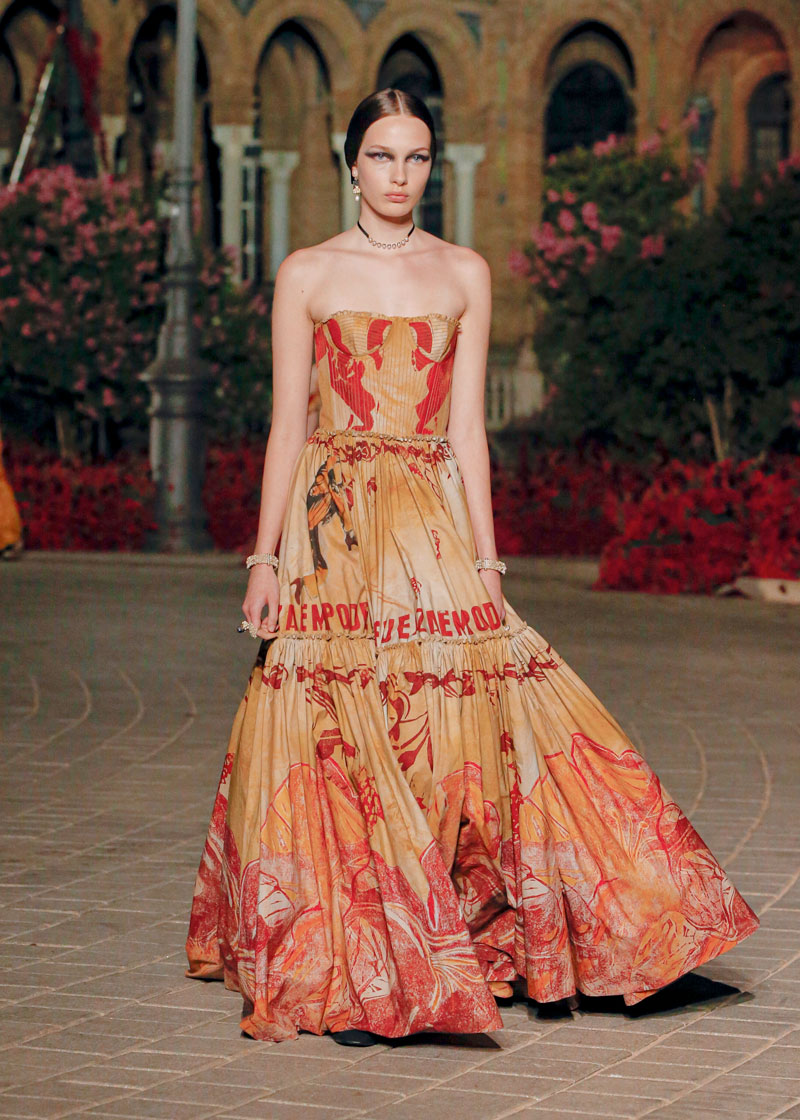 A las partes inferiores, los vestidos y las faldas de volantes fueron los protagonistas de la colección Cruise 23 de Dior; referenciando obviamente al traje de sevillana. Aunque para no perder las costumbres francesas, la colección ofrece una falda corta estampada. Luego vimos el traje de sevillana en toda regla, pero en versión Dior y presentado en cinco colores que conectaban a la firma francesa con nuestra tradición de una manera muy bien lograda. El desfile terminó con tres vestidos estampados en beige y rojo, con motivos referentes a la cultura española y al fuego.