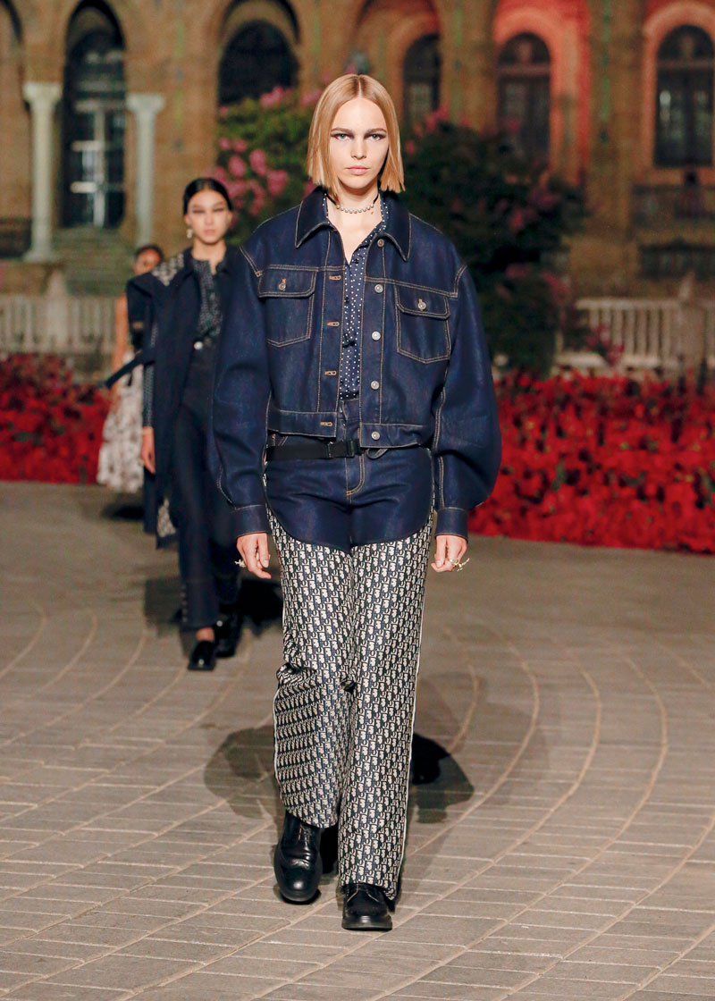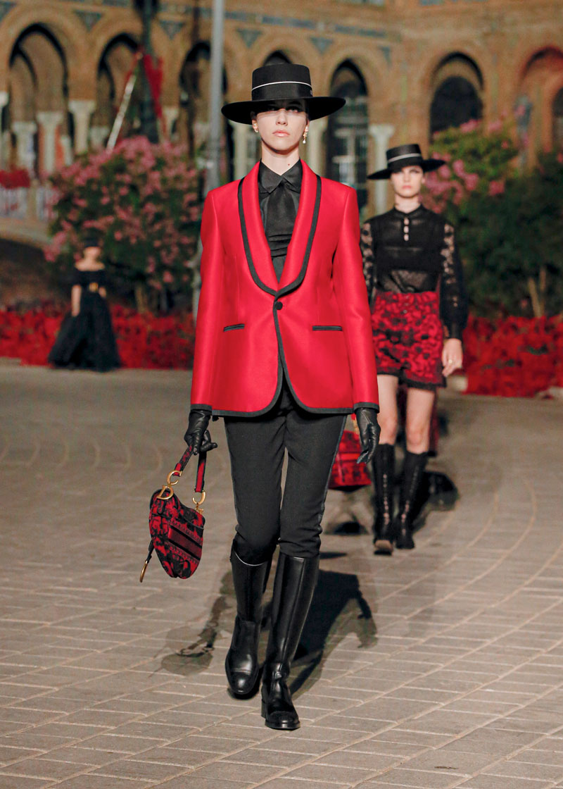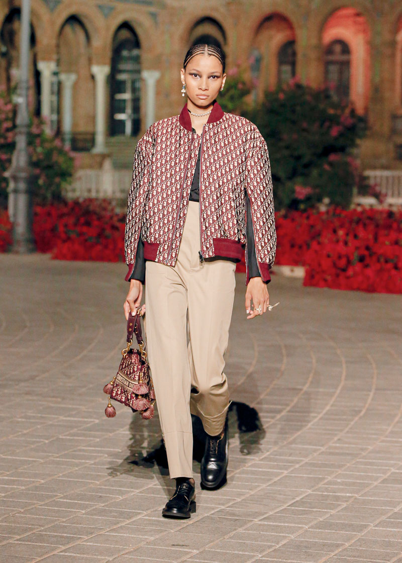 Las partes superiores de la colección que vimos en el desfile de Dior en Sevilla beben mucha inspiración de los trajes típicos de sevillana con sus grandes volantes y telas satinadas. También están presentes chaquetillas estilo torero con una gran decoración en brocados, blusas sin hombros… todos elementos clásicos andaluces puestos en contraste con elementos de sastrería clásica (que podrían acercarse también al mundo de la hípica). Y para los amantes del Dior de siempre vimos también una pequeña selección de prendas en denim y una bomber en el clásico Monogram Oblique en rojo (porque nuevas versiones de los iconos de Dior nunca vienen mal).