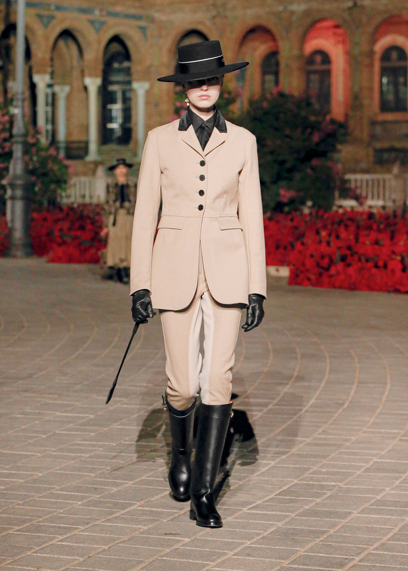Miremos ahora las claves para entender el discurso del desfile de Dior en Sevilla; que son pocas, pero esenciales. Estéticamente, la colección Cruise 23 de Dior tiene como foco central de inspiración el traje de sevillana (naturalmente) y el traje de corto masculino con sombrero cordobés… tampoco podía faltar un guiño al mundo de la hípica ni el mantón de Manila; todos elementos centrales del léxico de la indumentaria tradicional andaluza.