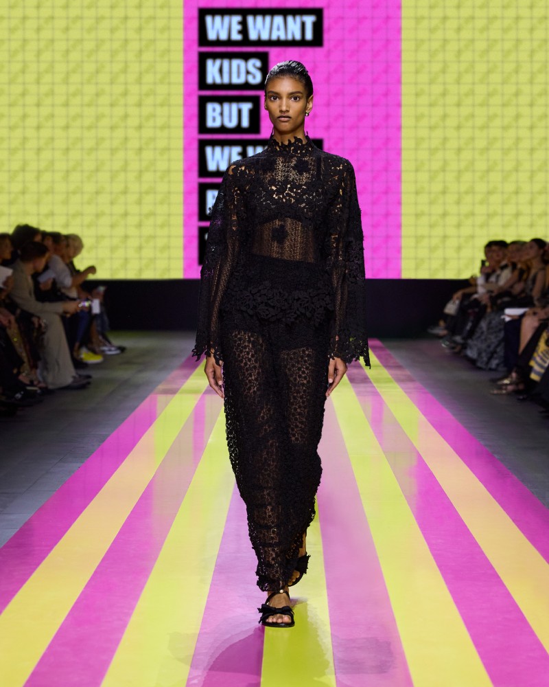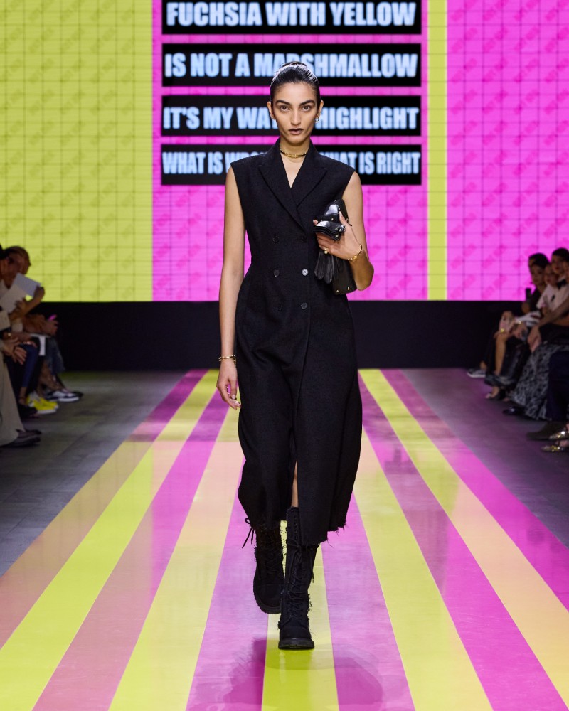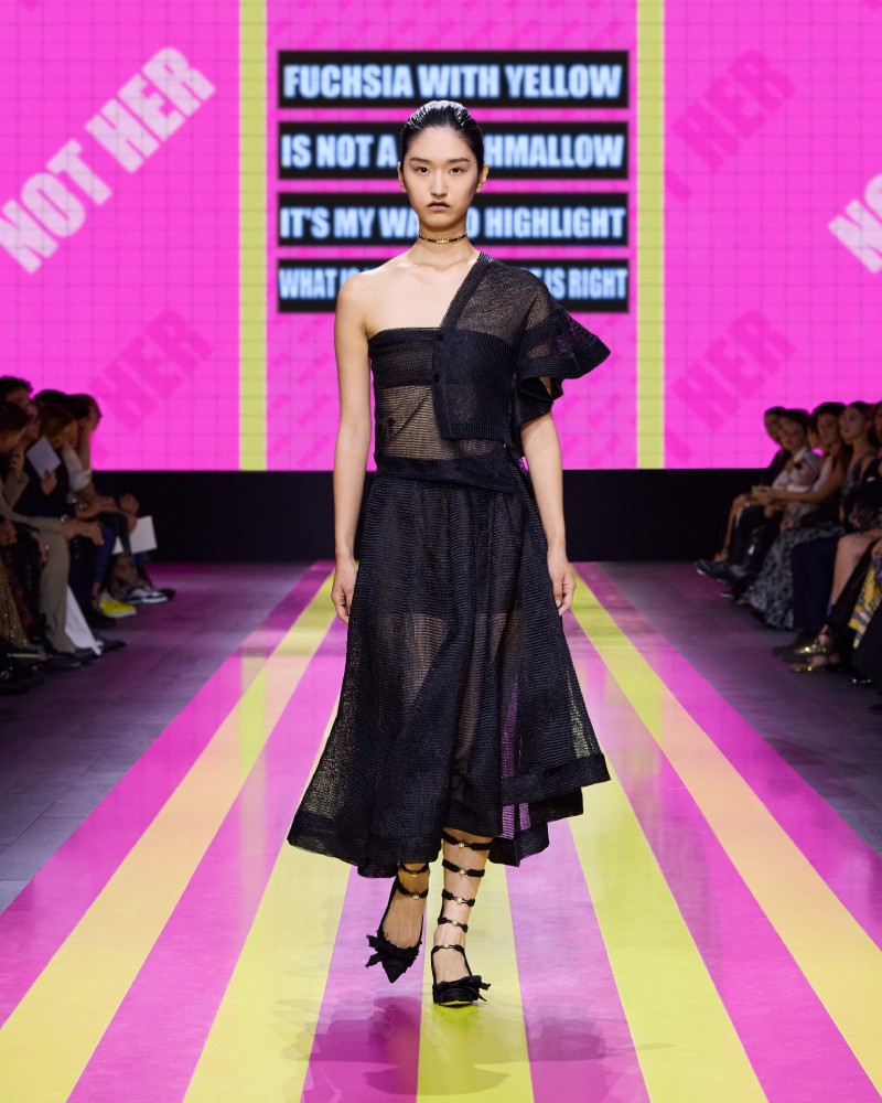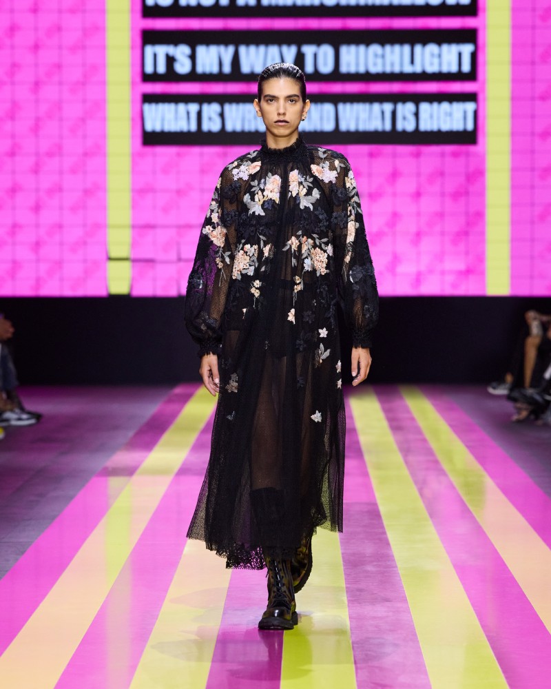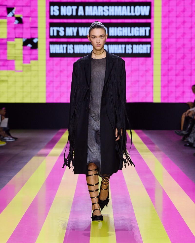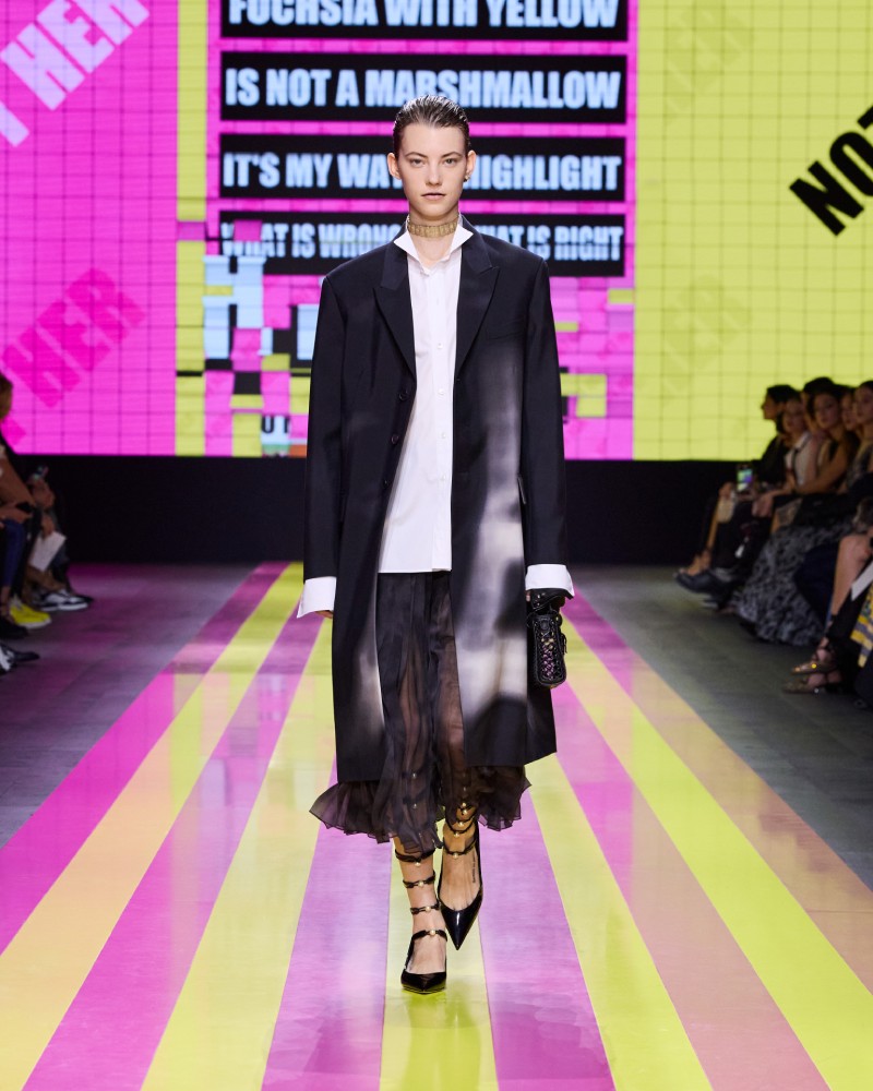 La escenografía ha jugado un papel clave en la entrega de este planteamiento. Las nuevas brujas del siglo XXI desfilaron con una instalación artística firmada por Elena Bellatoni. Citas como “No pertenezco a nadie más”, “No soy tu muñeca” y “mi cuerpo no es un producto” decoraban el trasfondo del desfile con colores estridentes, para contrastar una paleta de colores extremadamente sobria y oscura.