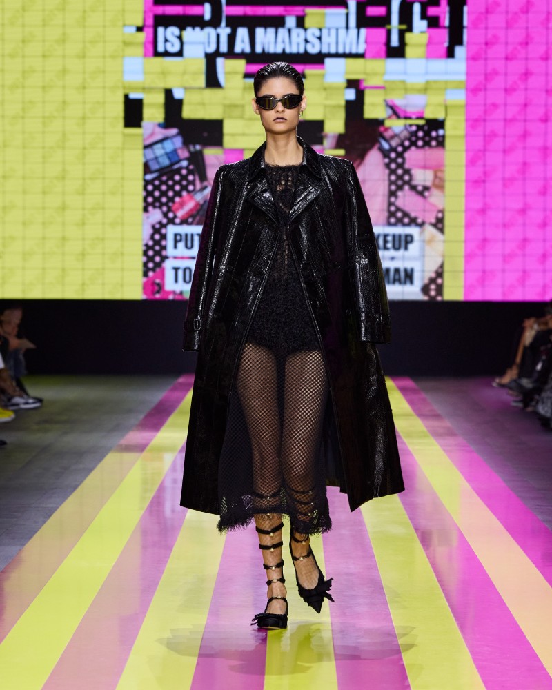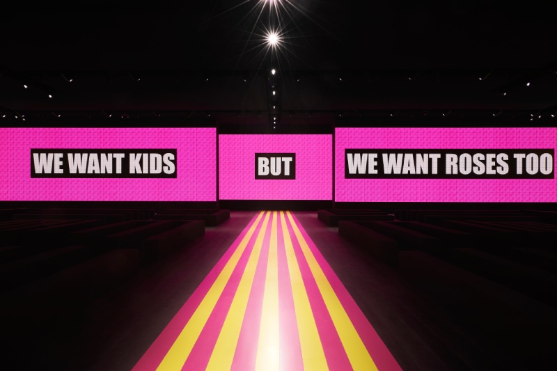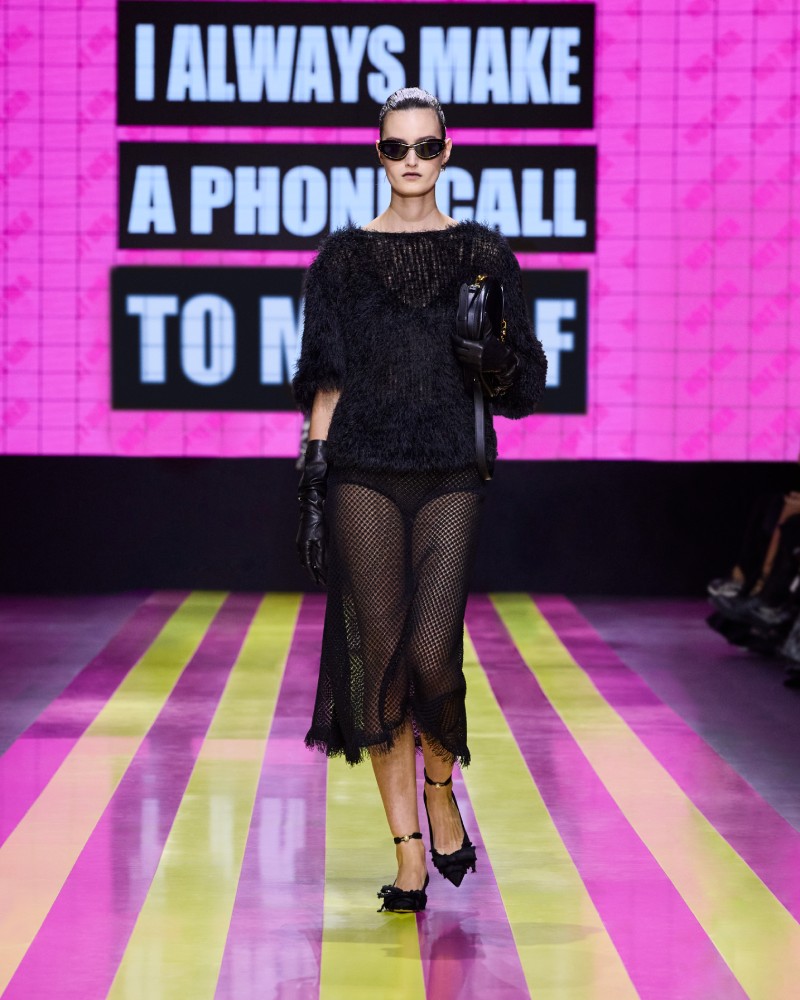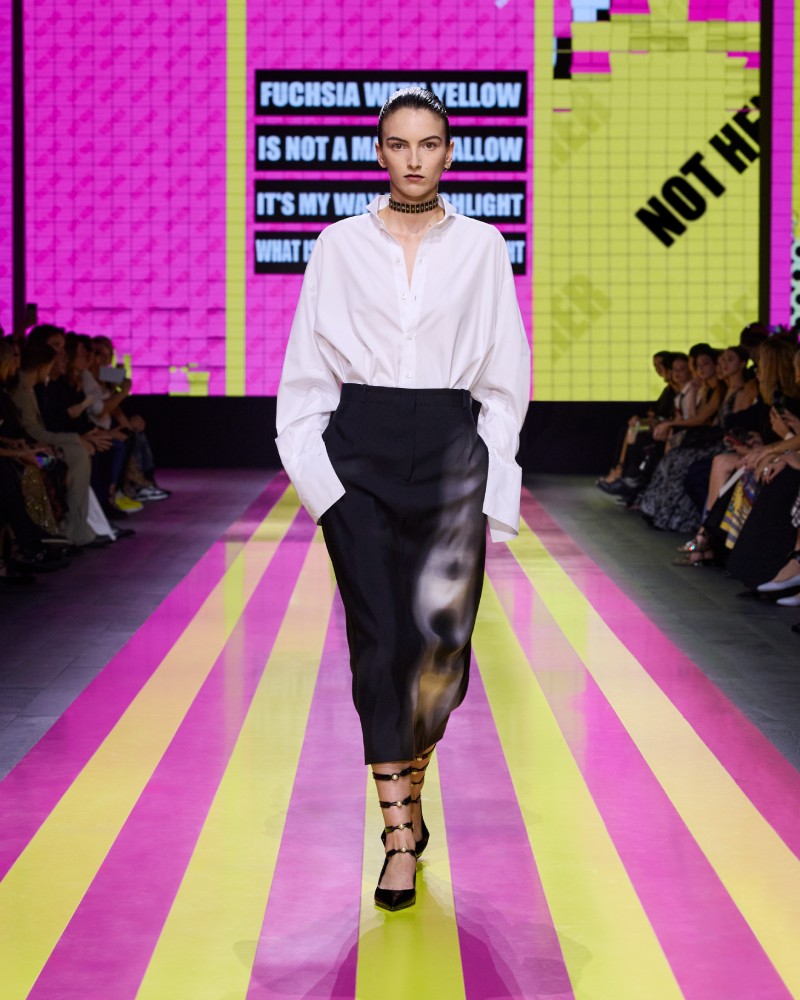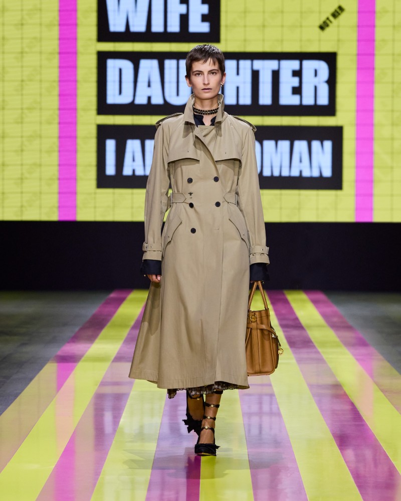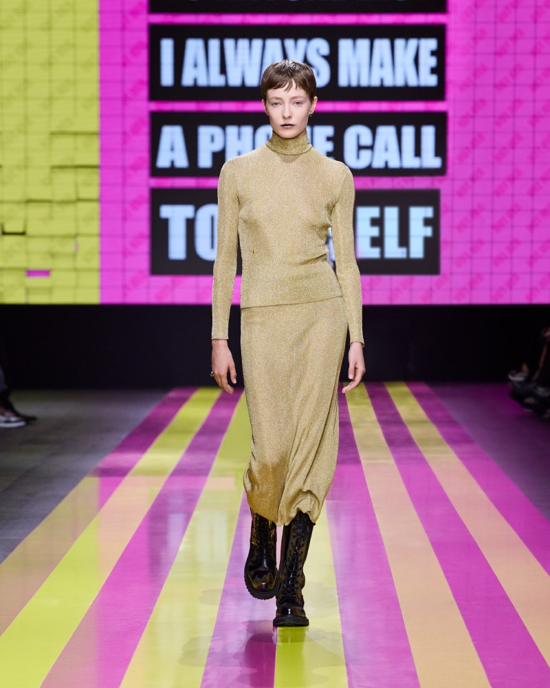 La escenografía ha jugado un papel clave en la entrega de este planteamiento. Las nuevas brujas del siglo XXI desfilaron con una instalación artística firmada por Elena Bellatoni. Citas como “No pertenezco a nadie más”, “No soy tu muñeca” y “mi cuerpo no es un producto” decoraban el trasfondo del desfile con colores estridentes, para contrastar una paleta de colores extremadamente sobria y oscura.