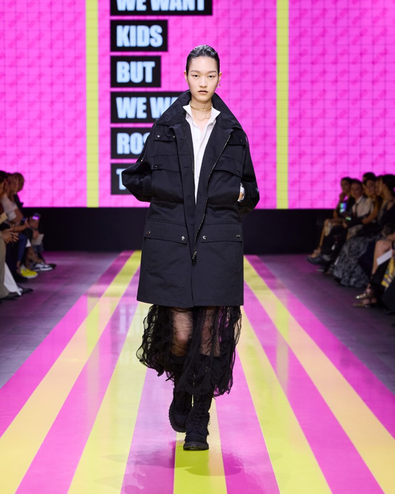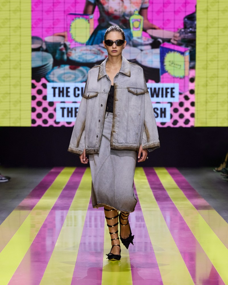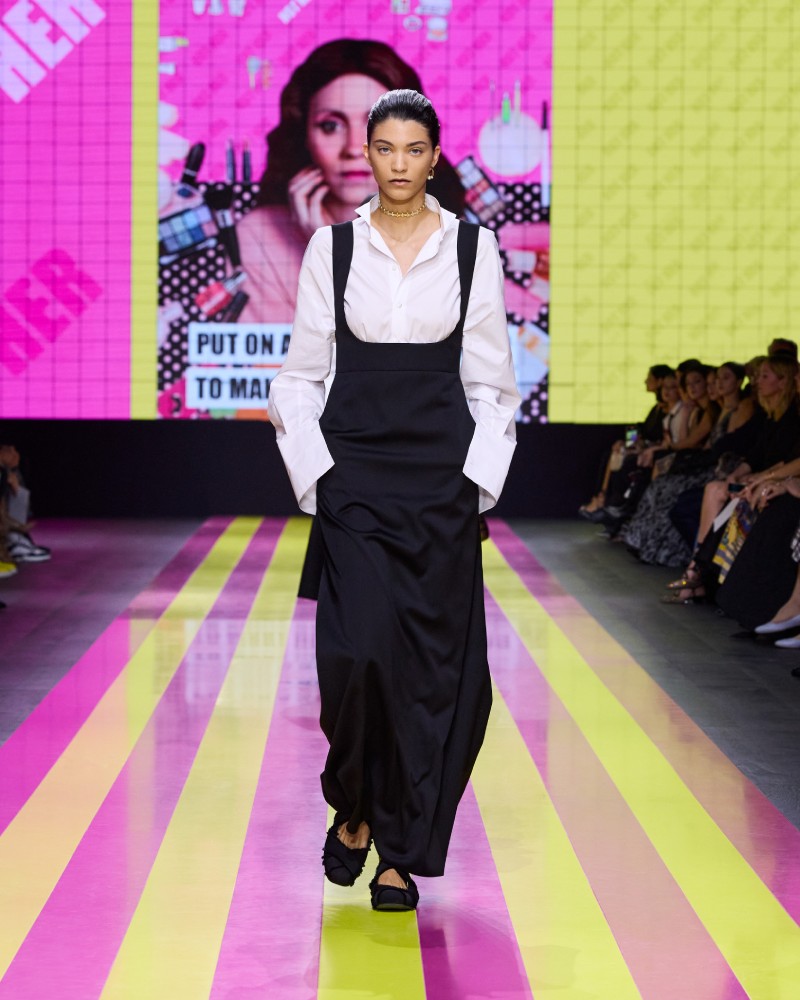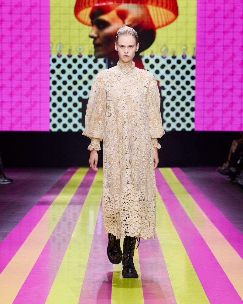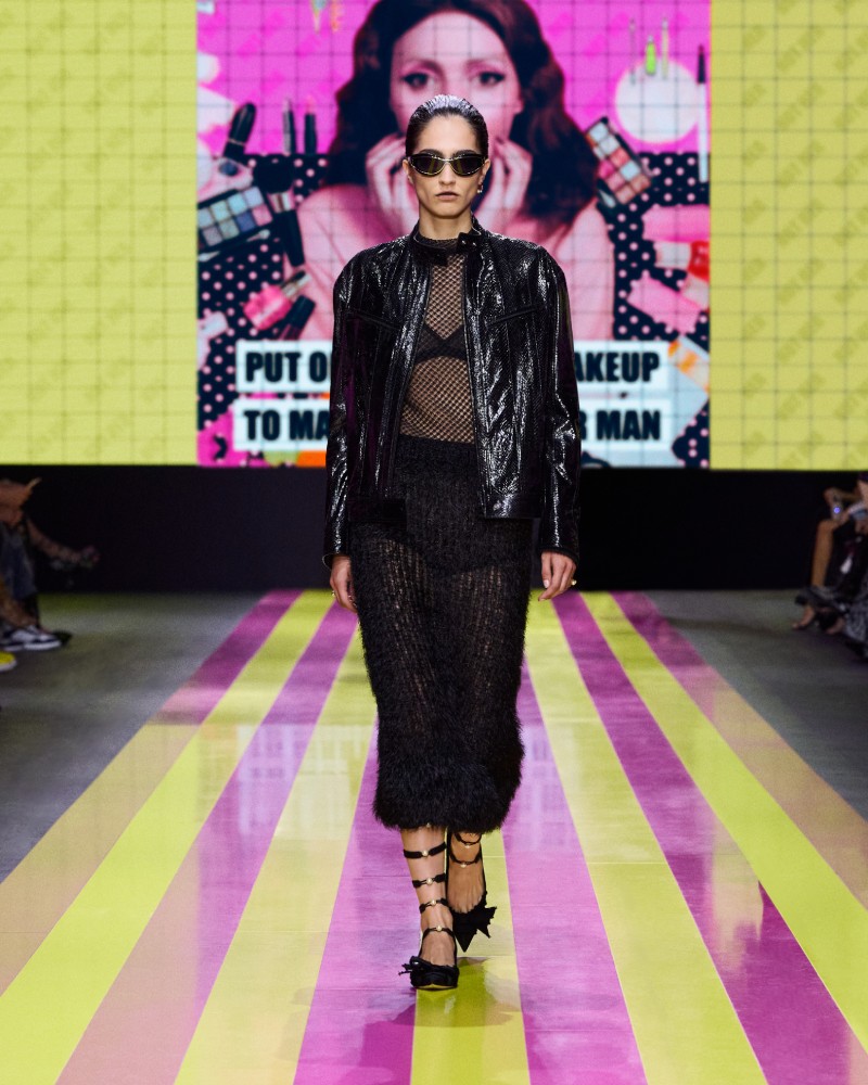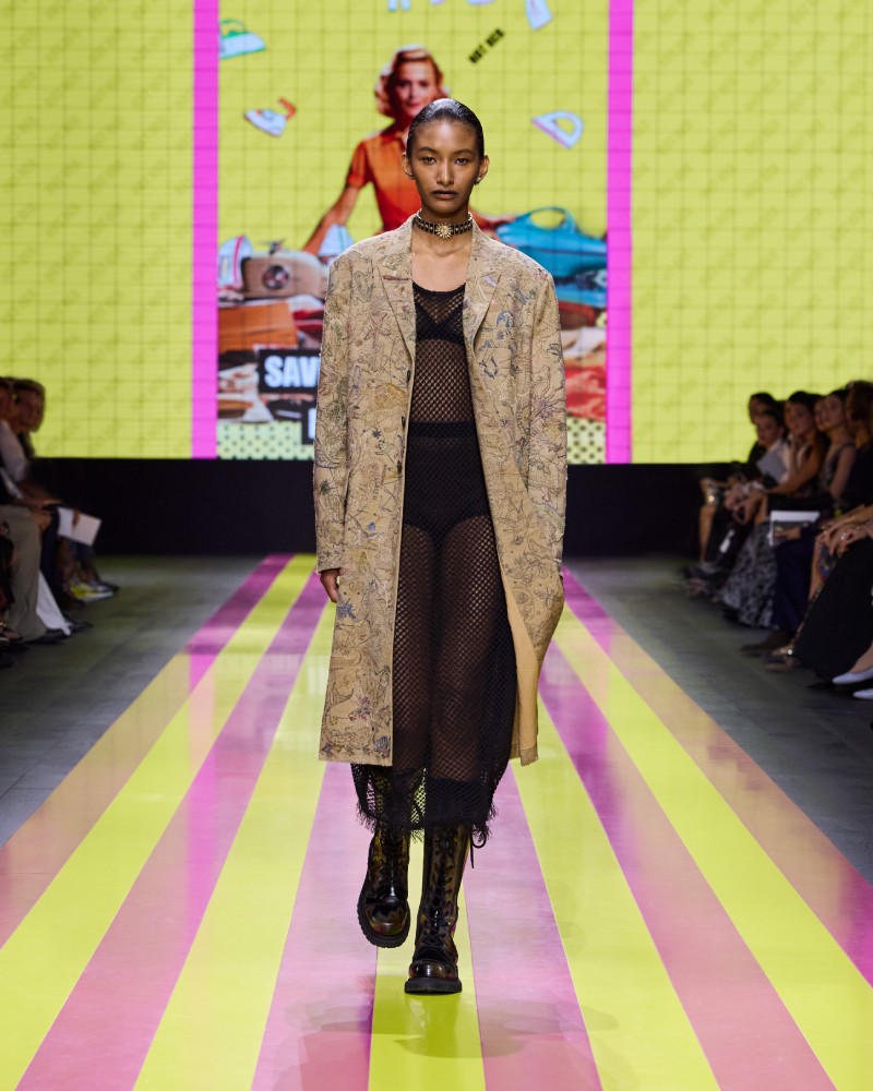 La escenografía ha jugado un papel clave en la entrega de este planteamiento. Las nuevas brujas del siglo XXI desfilaron con una instalación artística firmada por Elena Bellatoni. Citas como “No pertenezco a nadie más”, “No soy tu muñeca” y “mi cuerpo no es un producto” decoraban el trasfondo del desfile con colores estridentes, para contrastar una paleta de colores extremadamente sobria y oscura.