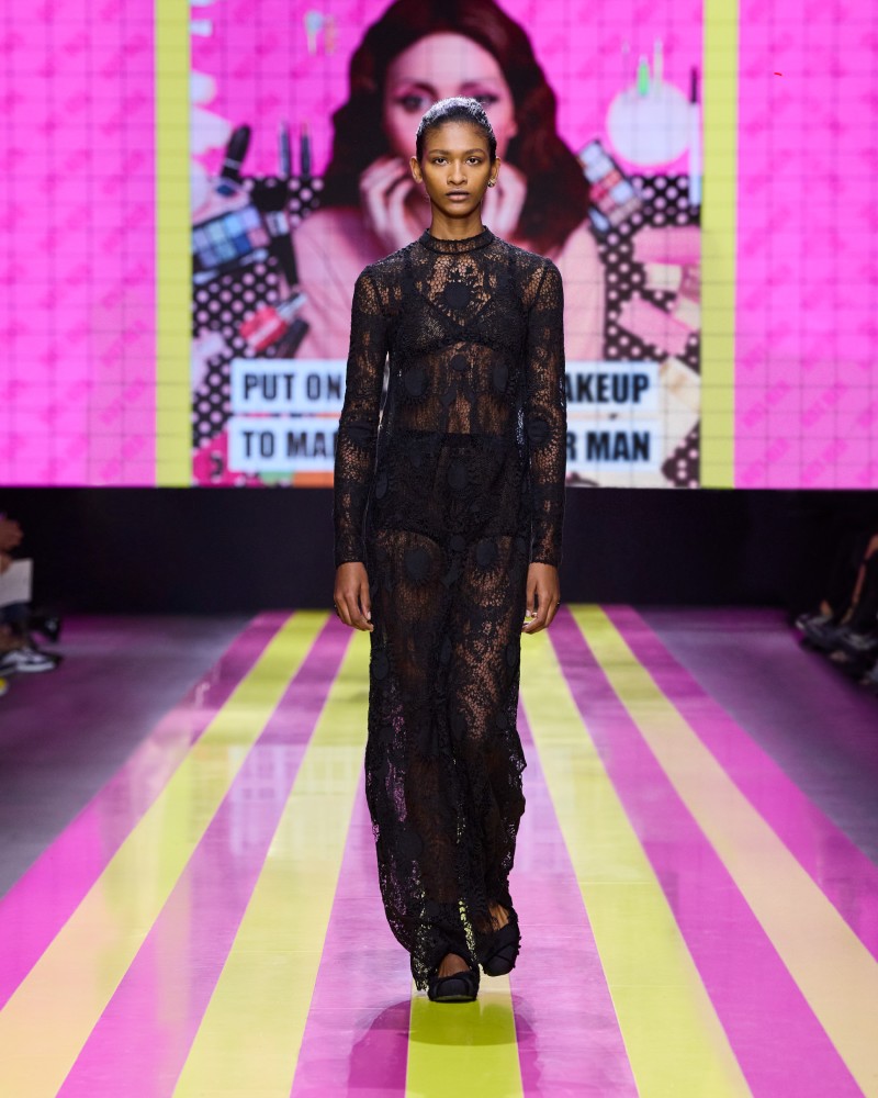 Rompiendo con esta atrevida sobriedad, Dior Primavera-Verano 2024 usa a la transparencia como nueva armadura. Conjuntos de encaje y malla negra se encargan de mostrar el cuerpo femenino, no como un objeto de deseo… sino como una obra de arte. A estos conjuntos, prendas de abrigo en cuero negro brillante de inspiración sartorial y motera se les suman para aportar ese aire de neo bruja. Las transparencias luego se exhiben en conjuntos de encaje con motivos místicos de color camomila, otro de los pilares de esta colección. El denim índigo y gris se encarga de constituir las prendas más casuales, recordando las cenizas de tiempos lejanos.