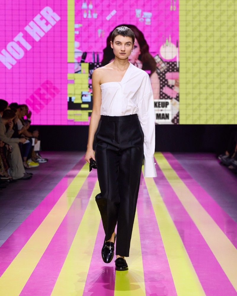Dior Primavera-Verano 2024 toma un acercamiento de adaptación y apropiación del armario masculino. Elementos clásicos de sastrería de hombre se convierten en armaduras medievales de verdadero escándalo. También, otras chaquetas más casuales masculinas se readaptan para cubrir el cuerpo de la nueva mujer Dior. Vestidos de chaqueta, tops de corte cropped derivados de cazadoras de lona encerada, chalecos de estilo café racer son las apuestas más literales dentro de este discurso. También, la deconstrucción y la asimetría han jugado un papel clave para readaptar las prendas masculinas a la mujer. Camisas blancas se presentan como foco central y se convierten en tops con hombro al aire y vestidos.