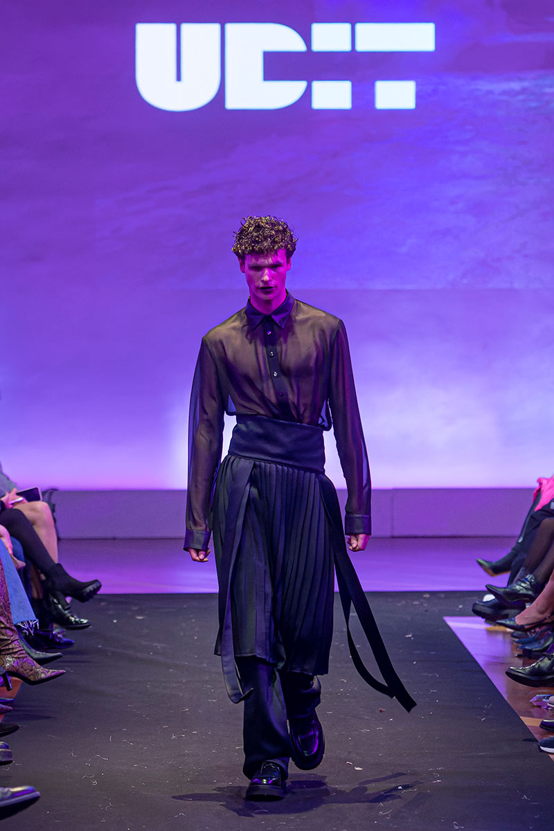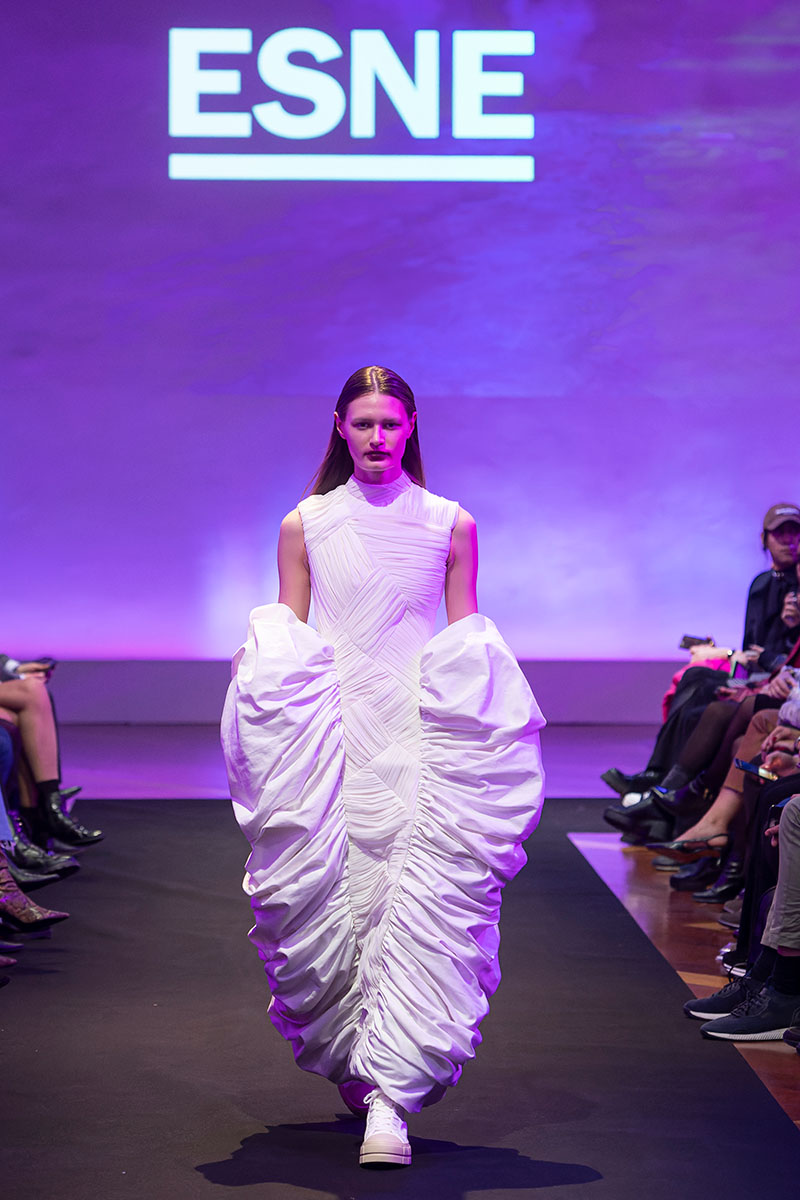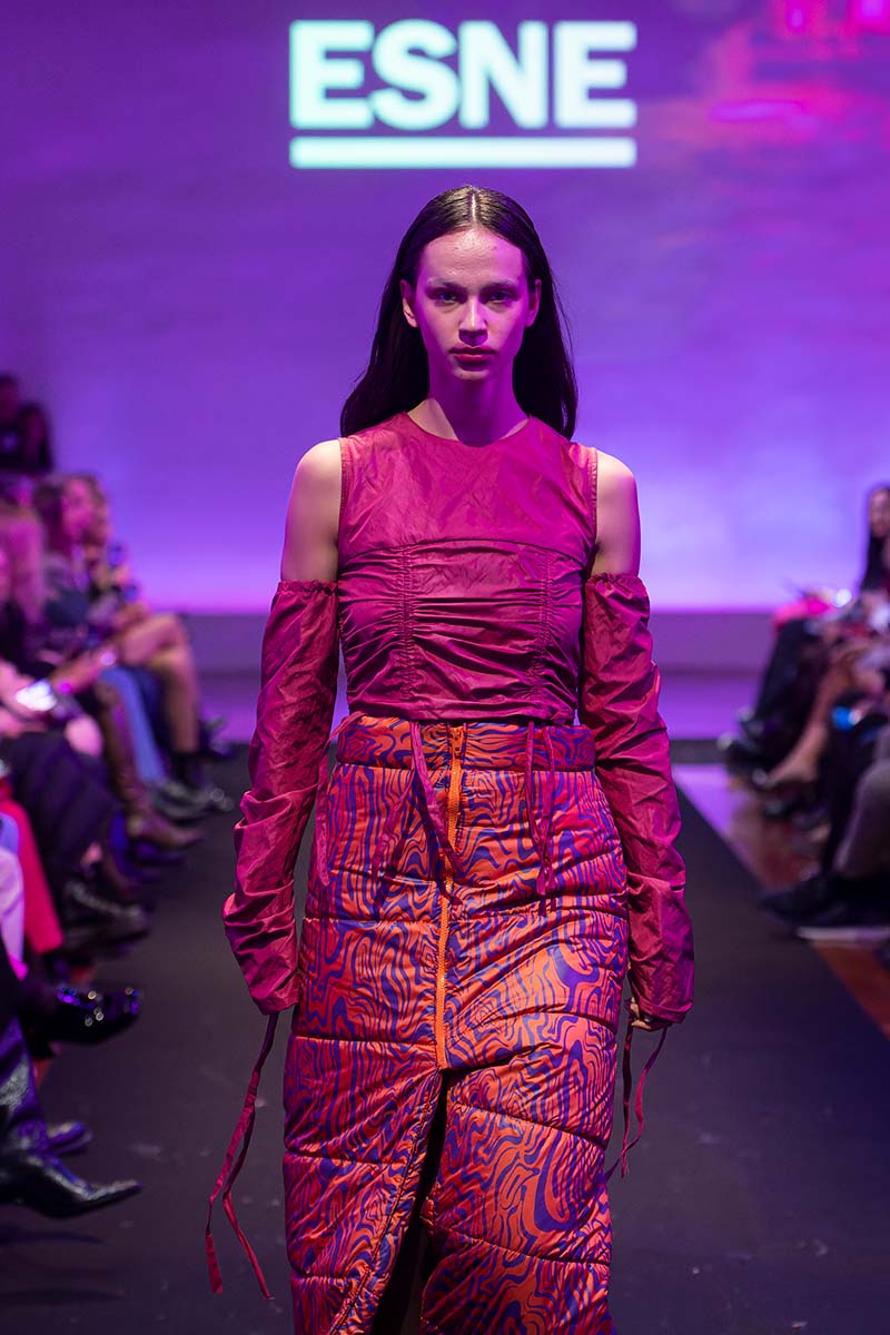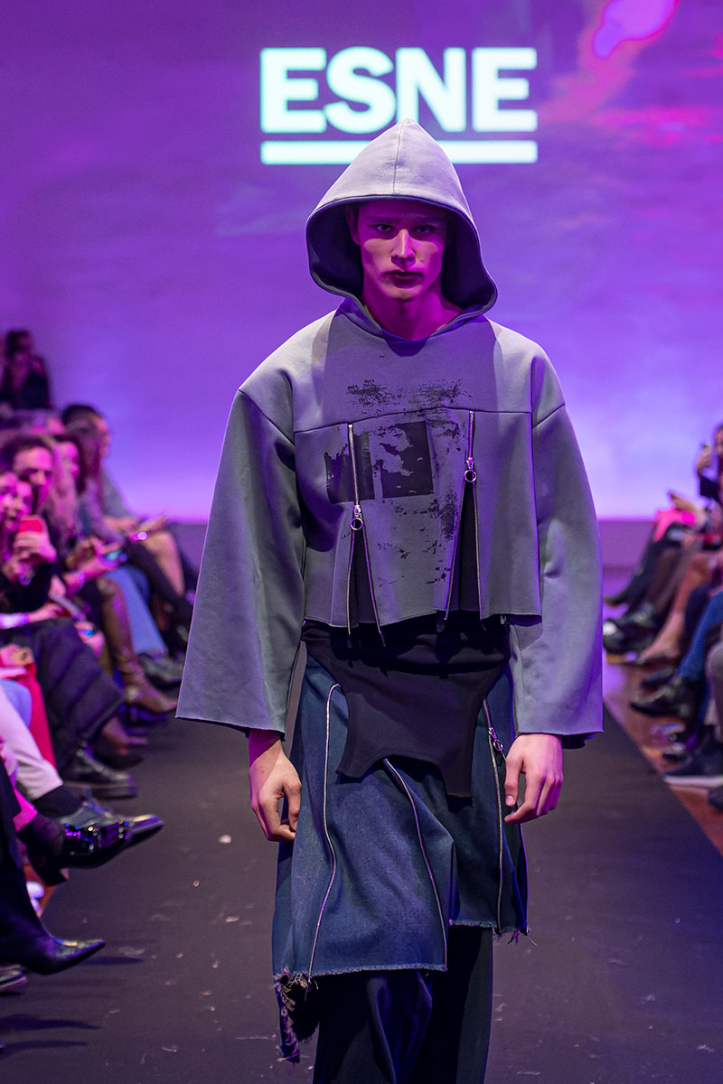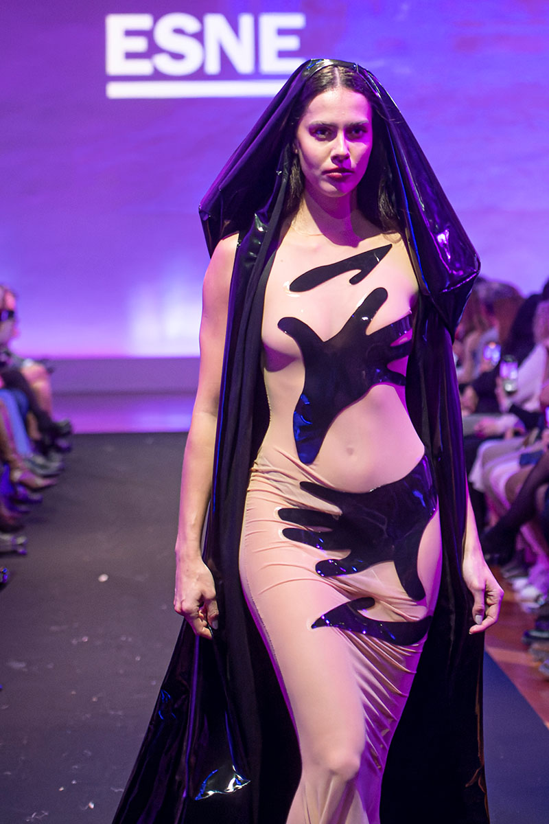 El desfile de la escuela ESNE presentó el trabajo de 39 estudiantes de último curso de Diseño de Moda en una Real Fábrica de Tapices llena de luces moradas y alguna de la tecnología de proyección 3D más impresionante. La colección “Paranoia” y todos los diseños de los alumnos estaba basada en la corriente actual del feísmo; entendida como una ruptura de todos los cánones de belleza establecidos hasta entonces e impulsada por algunos de los nombres más importantes del panorama mundial. Cada joven diseñador presentó tres looks bajo estas directrices; tocando temáticas sobre la salud mental, sustancias e incluso hasta la conceptualización de las nuevas tribus urbanas del Siglo XXI.