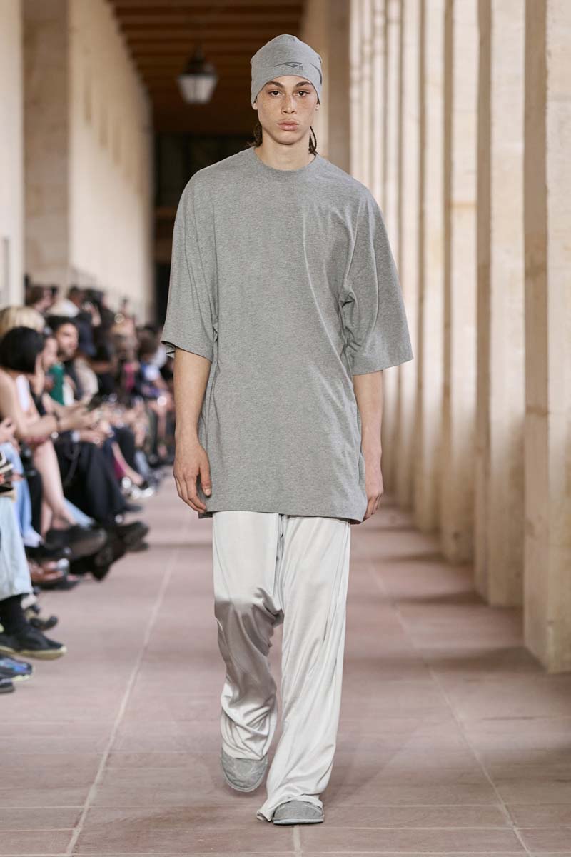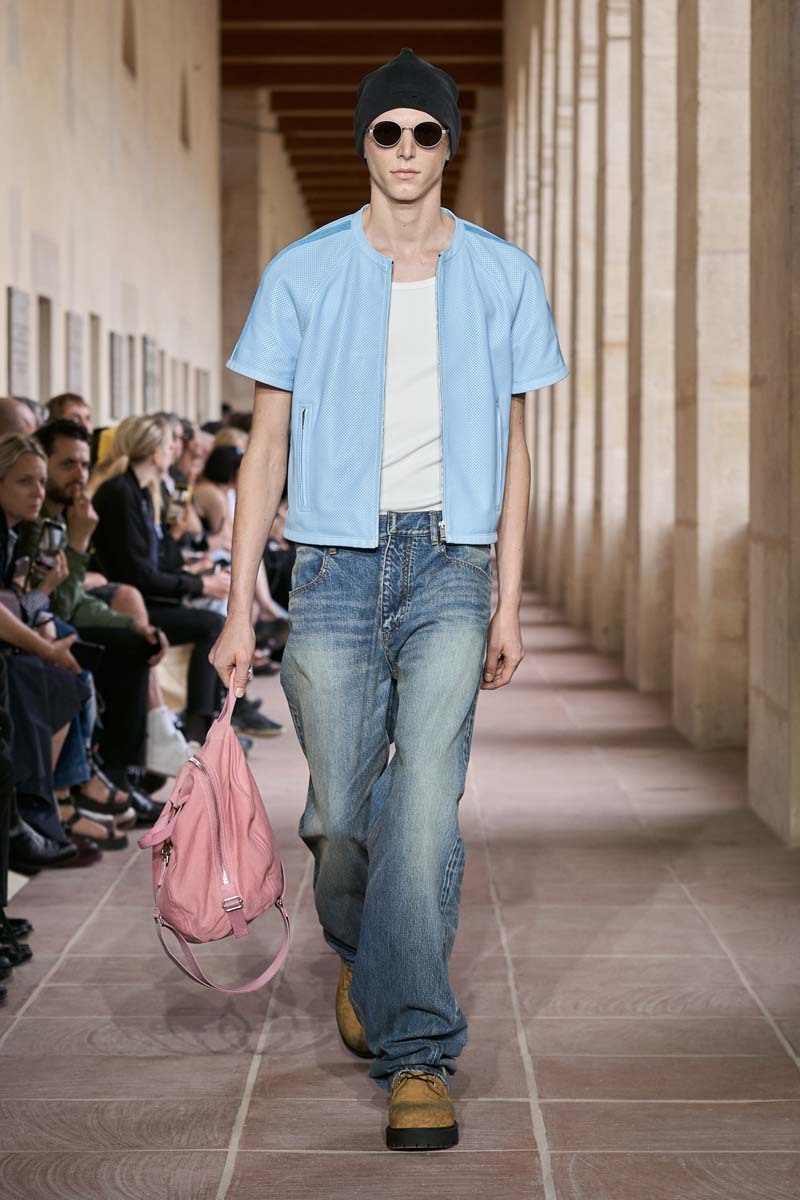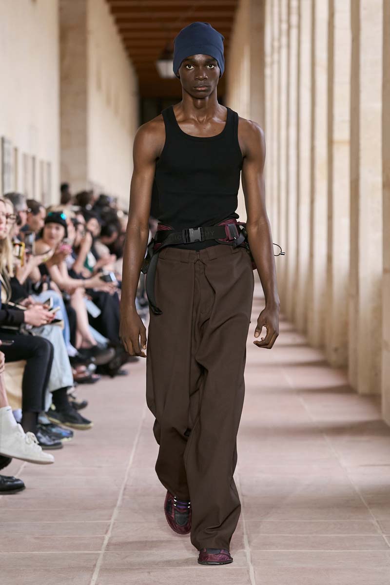 Elementos distintivos del lenguaje Alyxiano también tienen su lugar; aunque en menor medida. Conjuntos de camiseta de tirantes negra y ceñida sobre pantalones cargo de corte baggy con un arnés utilitario desentonaban tanto clasicismo. A su vez, parkas utilitarias de colorblock servían para llevar a un terreno más urbano los conjuntos de traje. Como nuevas propuestas para Givenchy SS24, vemos el regreso de la camiseta alargada y oversized; con algunas iteraciones decoradas con ojales metálicos maxi. El chándal de nylon, los vaqueros de corte baggy y una que otra pieza en cuero negro cerraban el componente más street y familiar al lenguaje de Williams.