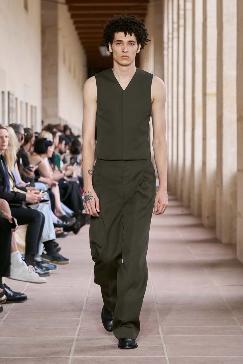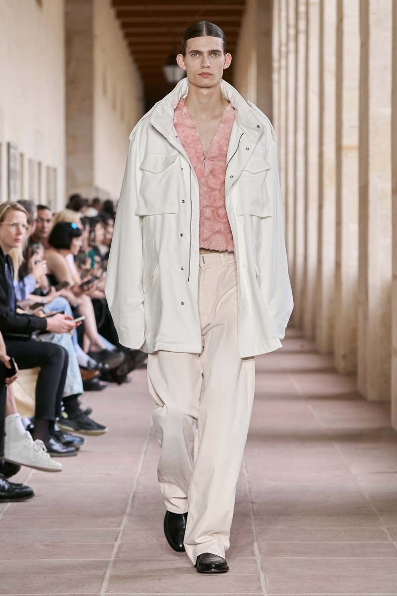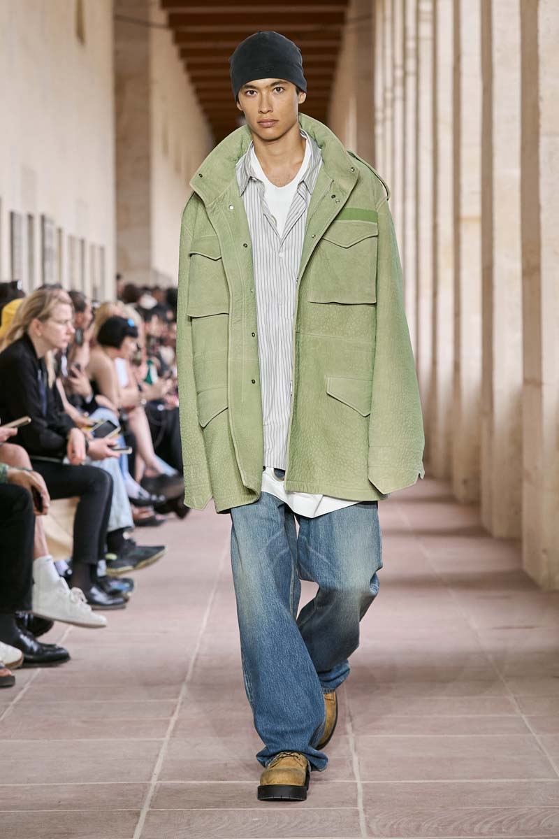 El componente de inspiración militar de Givenchy SS24 hace de nexo entre el clasicismo sartorial y las prendas más al estilo urbano de MMW. Una reinterpretación de la chaqueta Eisenhower en forma de blazer con pantalón a conjunto en verde militar encabeza este componente. También nos encontramos prendas más casuales de la misma inspiración: siluetas bomber y de aviador en paletas de colores similares se dejan ver en algunos looks. Sin embargo hay una pieza que hay que destacar, al menos en mi opinión, y es la versión oversized y en cuero de la mítica chaqueta de campo M-65; el estilo de siempre, ahora visto en sobreproporción utilitaria.
