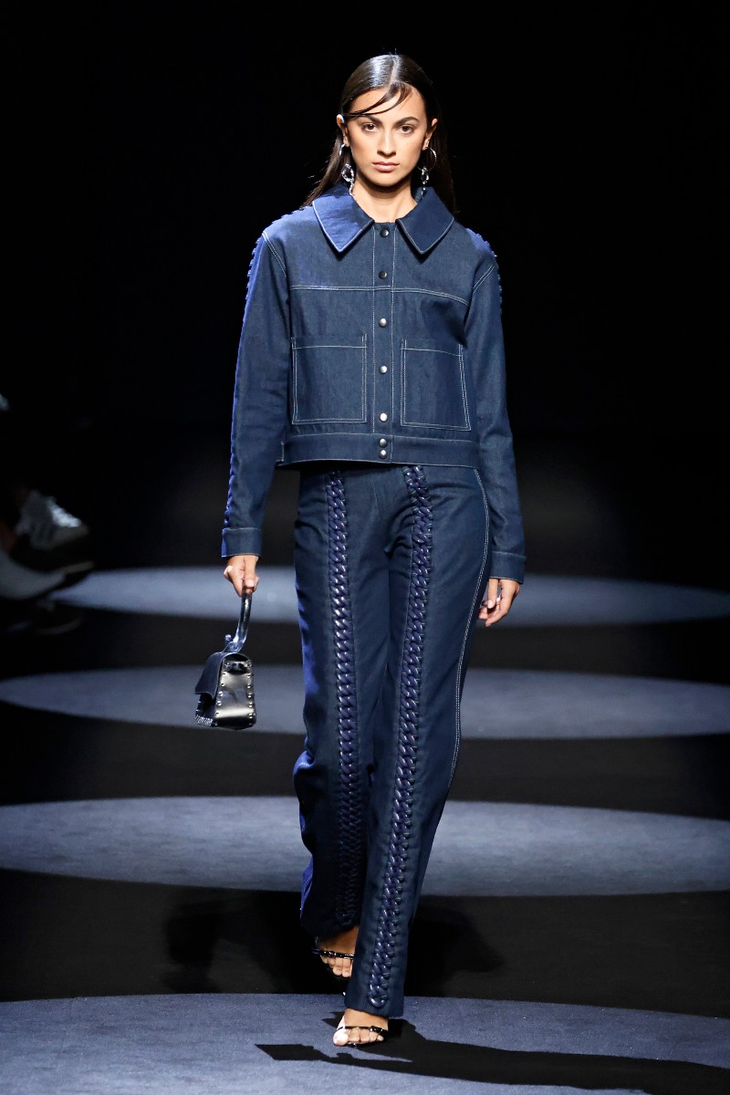 A destacar, la utilización de paños de lana merina, puntos de seda, poliéster reciclado o tejidos deadstock provenientes de excedentes. Materiales que son fundamentales en cada colección anual de JC Pajares, y por supuesto en esta no podía ser menos. Sin olvidar, que aparte de la introducción de estos tejidos hay también fibras recicladas y biodegradables. Hechos que confirman el compromiso que tiene JC Pajares con el medio ambiente y el control del consumo de la moda. Él piensa que su marca es lujo, pero no tiene que alterar el estado de salud del planeta. Y si alguien tiene duda que es imposible hacer esto, que mire en la falda midi plisada de color naranja o el total look denim con tachuelas por todos los lados.