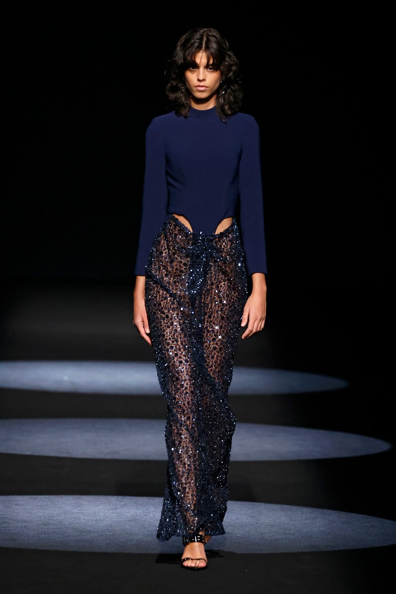 Falda larga transparente con piedras preciosas y un body en azul marino con aperturas.