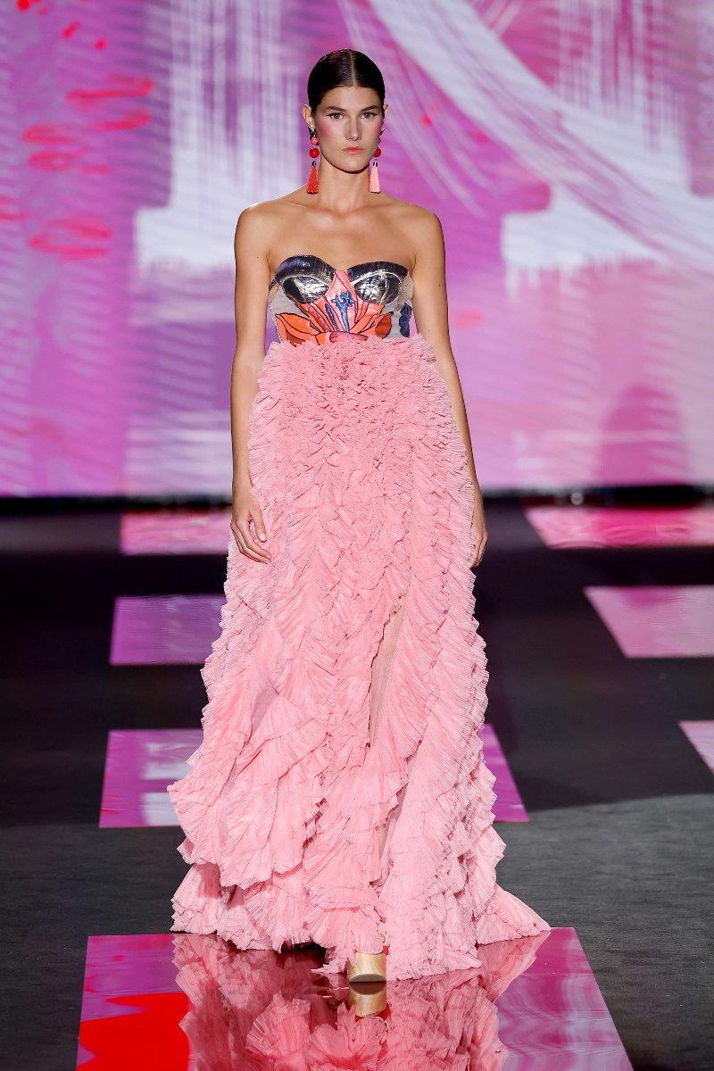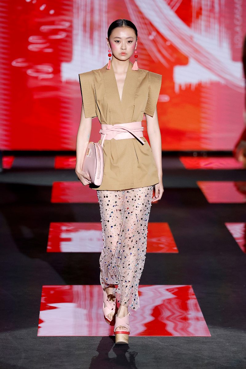 Como en otras ocasiones, en este desfile de Lola Casademunt by Maite se ve como ella es capaz de transformar y reinterpretar una historia o una inspiración y darle el toque Casademunt. En otras palabras, el ADN de la marca estaba en tejidos satinados, con lentejuelas o con tul de fantasía, además de las referencias al mundo japonés y todo ese misterio que lo envuelve. Tal y como dice Maite Casademunt “es una colección llena de contrastes. Por ejemplo en el caso de los volúmenes de las prendas, encontramos algunos tejidos muy ligeros, pero a la vez hay patrones estructurados. Sin olvidar la combinación del estilo femenino y delicado de las geishas con la modernidad y los eclécticos del Japón actual”.