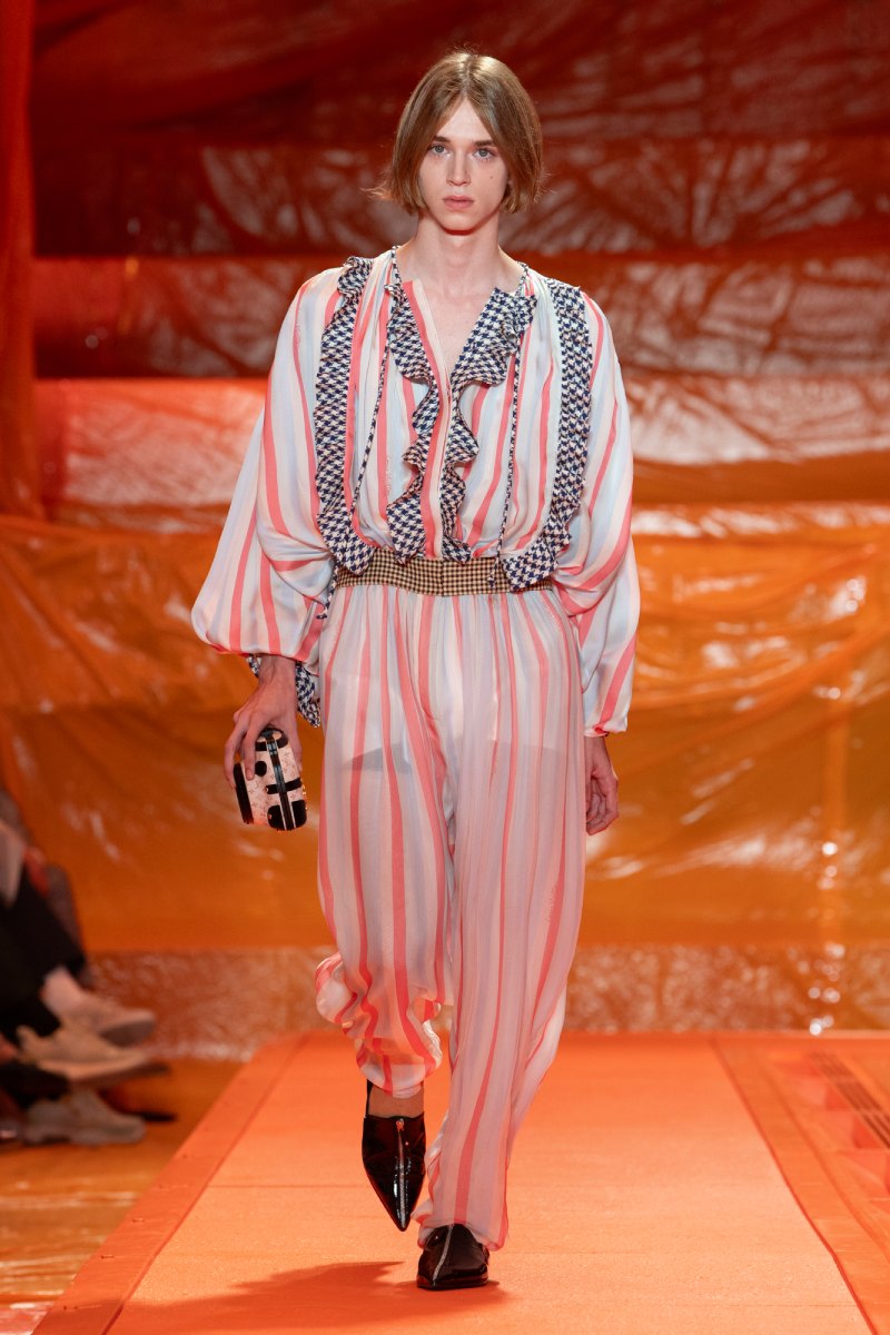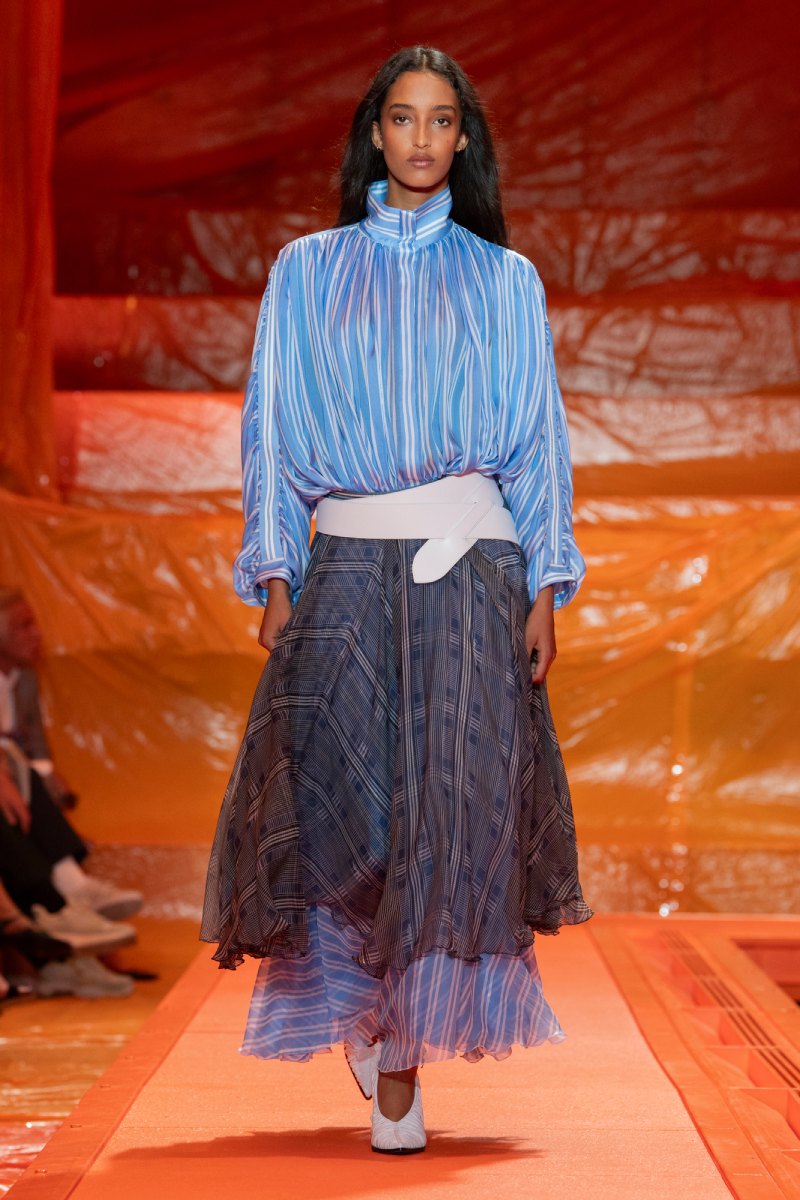 Un fuerte componente aventurero delimita la estética de la colección. Para lograrlo, Ghesquière mezcla elementos esenciales del estilo parisino con matices altamente funcionales, sin sacrificar puntos de sofisticación y elegancia. Chaquetas, camisas y blusas se presentan con dimensiones oversized y volúmenes exagerados. Hombros escultóricos, mangas abullonadas y elementos de distintos periodos del Siglo XIX se encargan de reimaginar prendas arquetípicas de la mujer parisina.