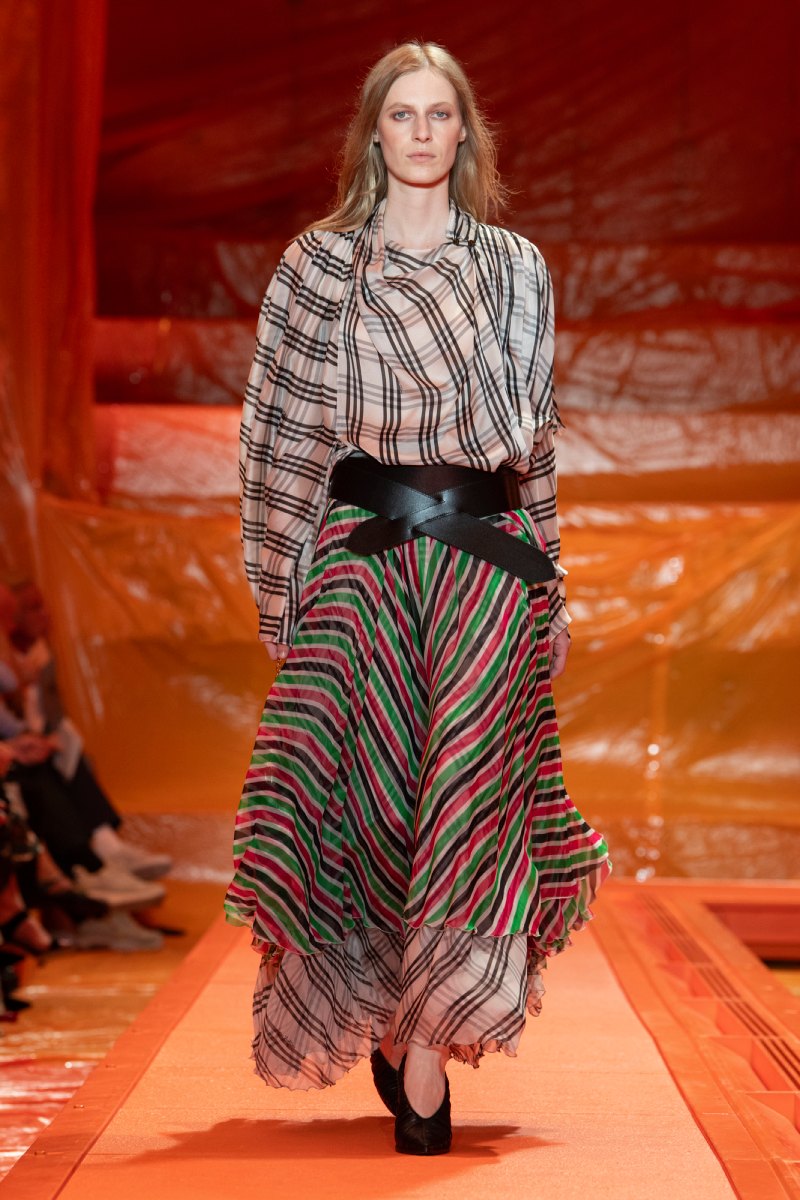 Otro de los puntos fuertes fueron los estampados, que fueron los responsables de aligerar el tono dentro de Louis Vuitton Mujer Primavera-Verano 2024. Pantalones de cintura alta a rayas, faldas con mucho vuelo de tartán, accesorios de cuadros, chaquetas de damero y pata de gallo… los prints, en combinación con estilos de retrospectiva son ese aire romántico del que tanto hablamos. Como guiño a los años 2000, maxi cinturones se encargan de resaltar la cintura en la nueva silueta de Louis Vuitton.