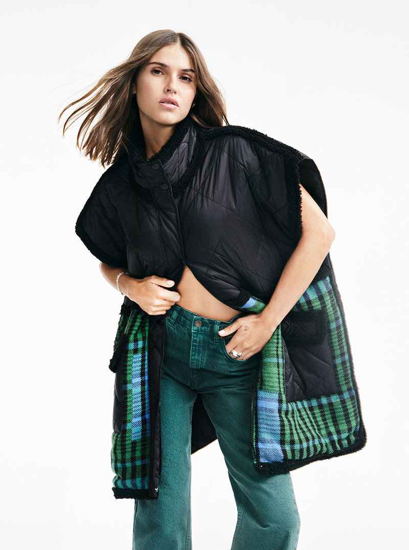 Para Gala Gonzalez las siluetas imprescindibles de este invierno son los vaqueros acampanados y el abrigo de tartán. En la campaña de Desigual Winter 2022 podemos ver cómo luce un modelo de jeans confeccionados con la técnica del upcycling que consiguen hacer un guiño de su “yo” más joven. Por otro lado lleva el abrigo de tartán multicolor compuesto de fibras sostenibles, con doble botonadura frontal, solapas y forro interior estampado. Una prenda que según Gala ha tenido en su armario desde pequeña hasta adulta y que debe de seguir en ahí.
