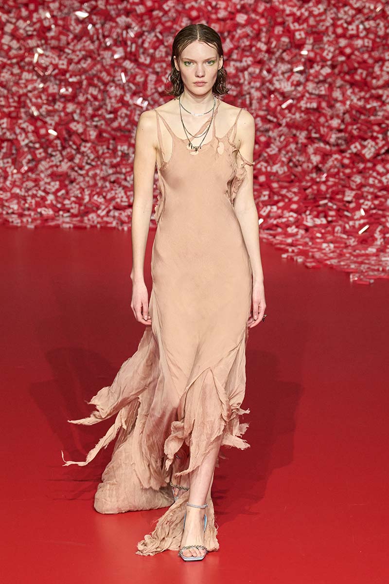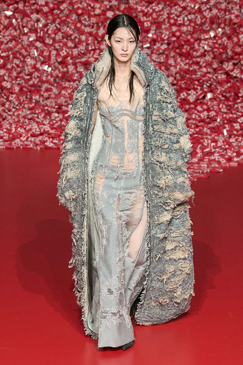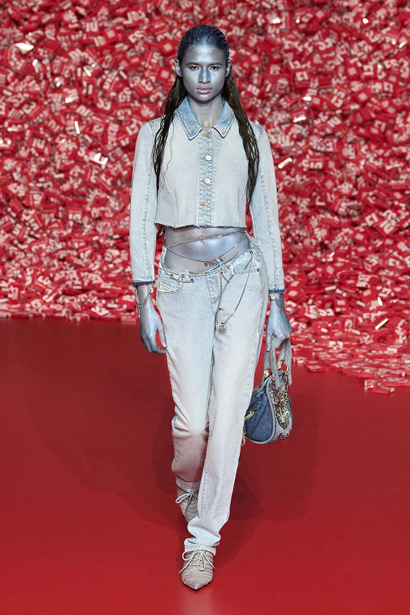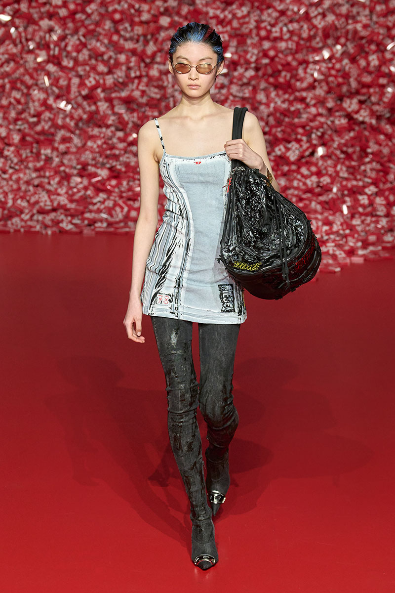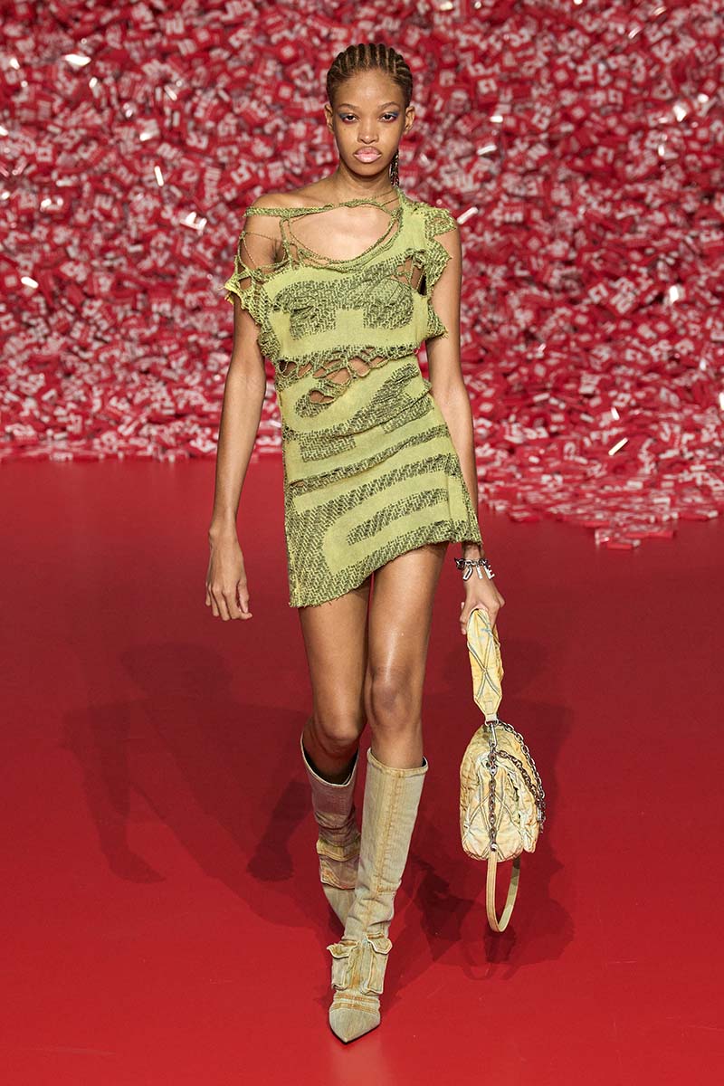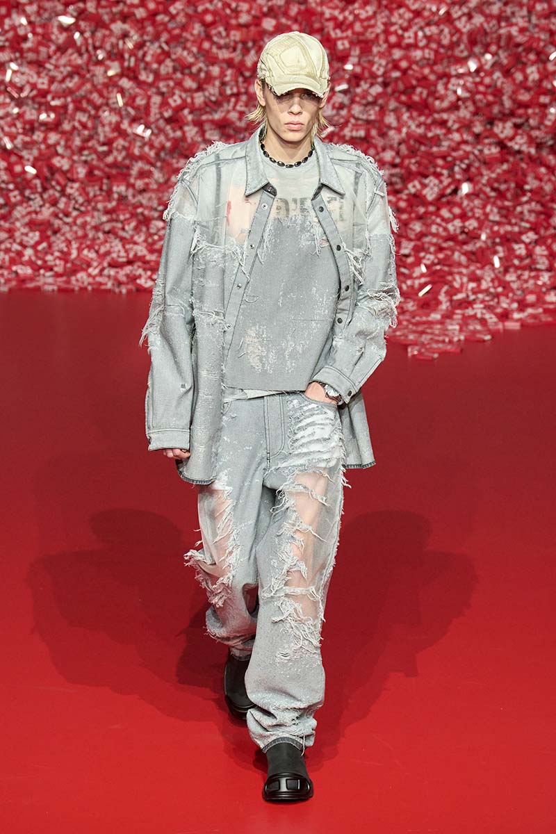 El desgaste en el denim es un comodín muy usado por los diseñadores más subversivos y edgy del panorama de la moda. Sin embargo, Diesel FW23 se lleva esto a un nuevo nivel a través de construcciones, o más bien deconstrucciones, al extremo del desgaste. Pero no os penséis que solo son vaqueros rotos; hay ingenio detrás. Muchas de las prendas de la colección tenían un efecto de desgaste, pero si nos acercamos un poco vemos que hay tela donde vemos piel; solo que muy transparente y muy bien colocada; como podemos ver en uno de los looks estrella de la colección: el vestido vaquero destruido cortado con láser. Esta misma técnica se cuela también en algunos vaqueros y tops unisex.
