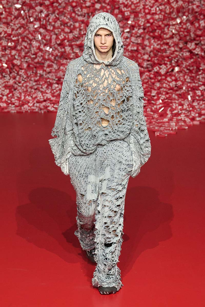 Con la tendencia dosmilera en alza junto con la del DIY, el crochet se ha ido colando de manera muy sigilosa en las tendencias urbanas. Diesel no ha sido la excepción, presentando tres looks construidos en crochet que perpetuaban aún más el tema del desgaste extremo. Como propuesta de esta corriente, tenemos conjuntos de chándal y vestidos.