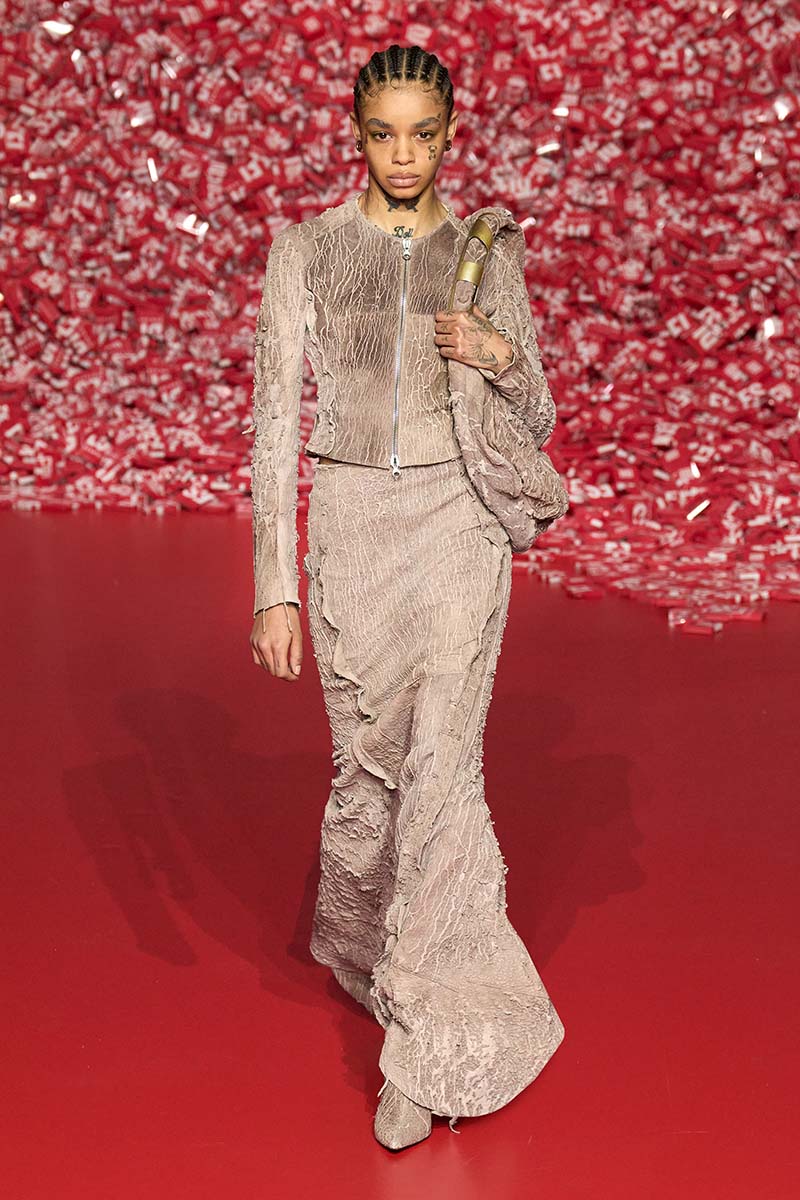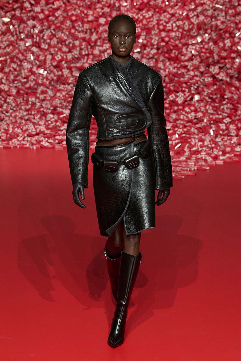 La piel también es uno de los puntos fuertes de Diesel; más allá de esta colección. Para FW23, Martens nos propone versiones destruidas de iconos en piel, revelando partes metálicas y con estéticas moteras del Y2K bastante fuertes. También el cuero es un material bastante sexy en reglas generales; y lo vimos cumpliendo ese papel en los looks enteros en negro, que daban el pego de dominatriz que sabe de moda.