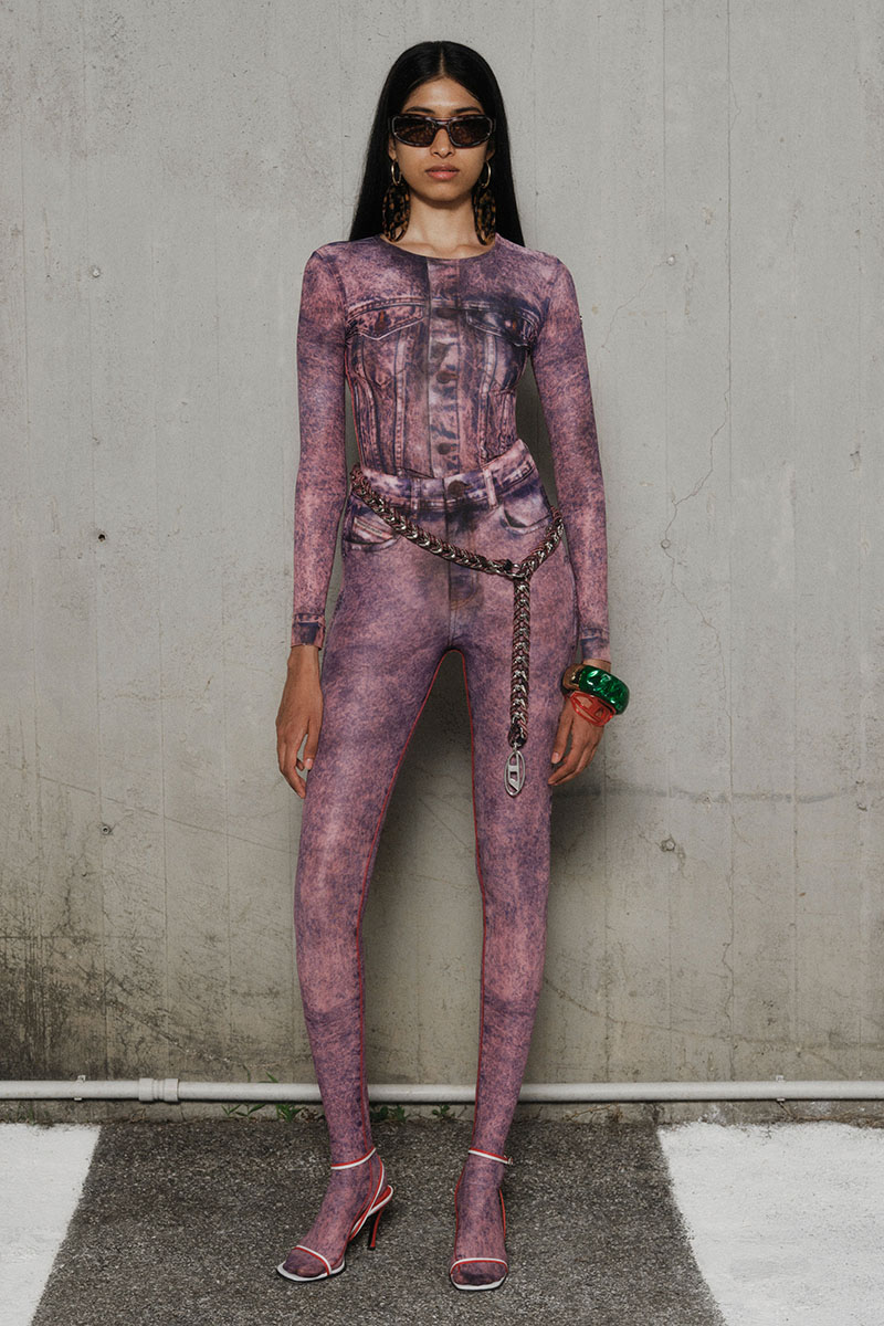 Diesel SS22 hace honor a la herencia de la marca de una forma peculiar: balares, camisas y pantalones de mezclilla representan una impresión láser que forma un efecto trampantojo de capas y costuras. Finalmente, una serie de piezas de mezclilla con logotipos Diesel en relieve representan la inclinación escultórica de Glenn Martens para Diesel SS22.