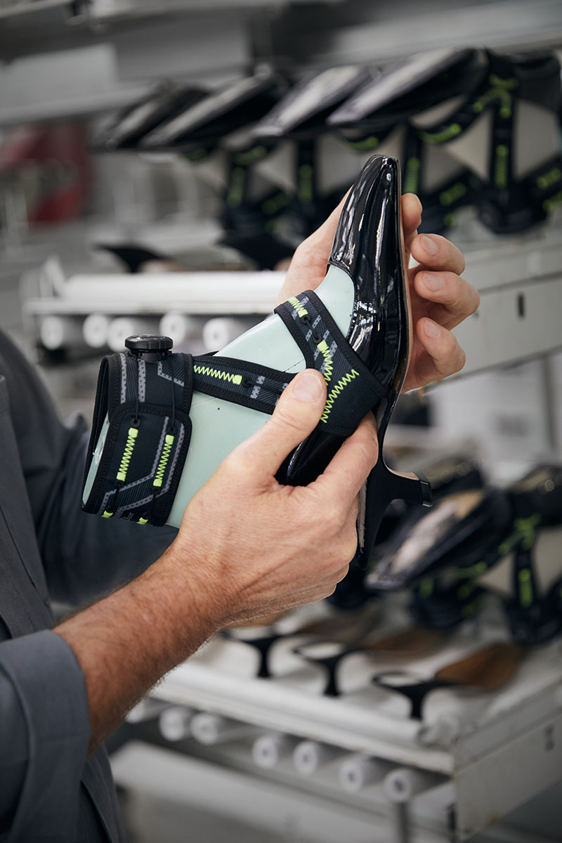 La correa de alta tecnología que sirve como toque final a una silueta de esencia atemporal se adapta perfectamente al tobillo, como si se tratara de una correa ajustable. Está fabricada a partir de neopreno ultra ligero, y destacan en su diseño las costuras de color amarillo fluorescente que hacen un guiño al mundo del motociclismo.