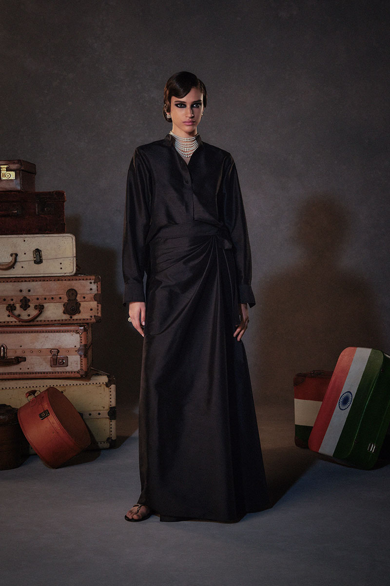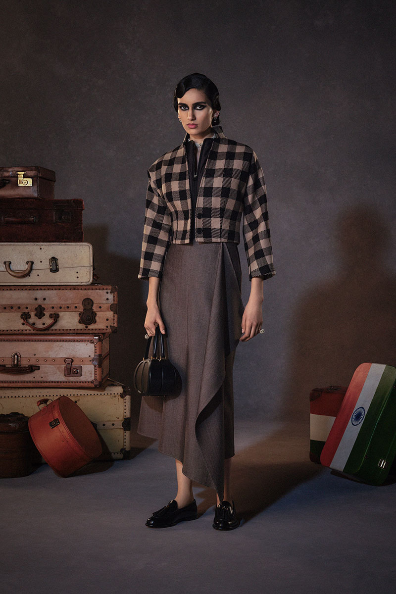 Un homenaje a Marc Bohan que se presenta en forma de abrigos de noche, faldas rectas inspiradas en los tradicionales saris y otros cortes tradicionales indios. La colección de Dior Fall 23 también incluye modelos de pantalones, pequeños boleros, chaquetas y sostenes.