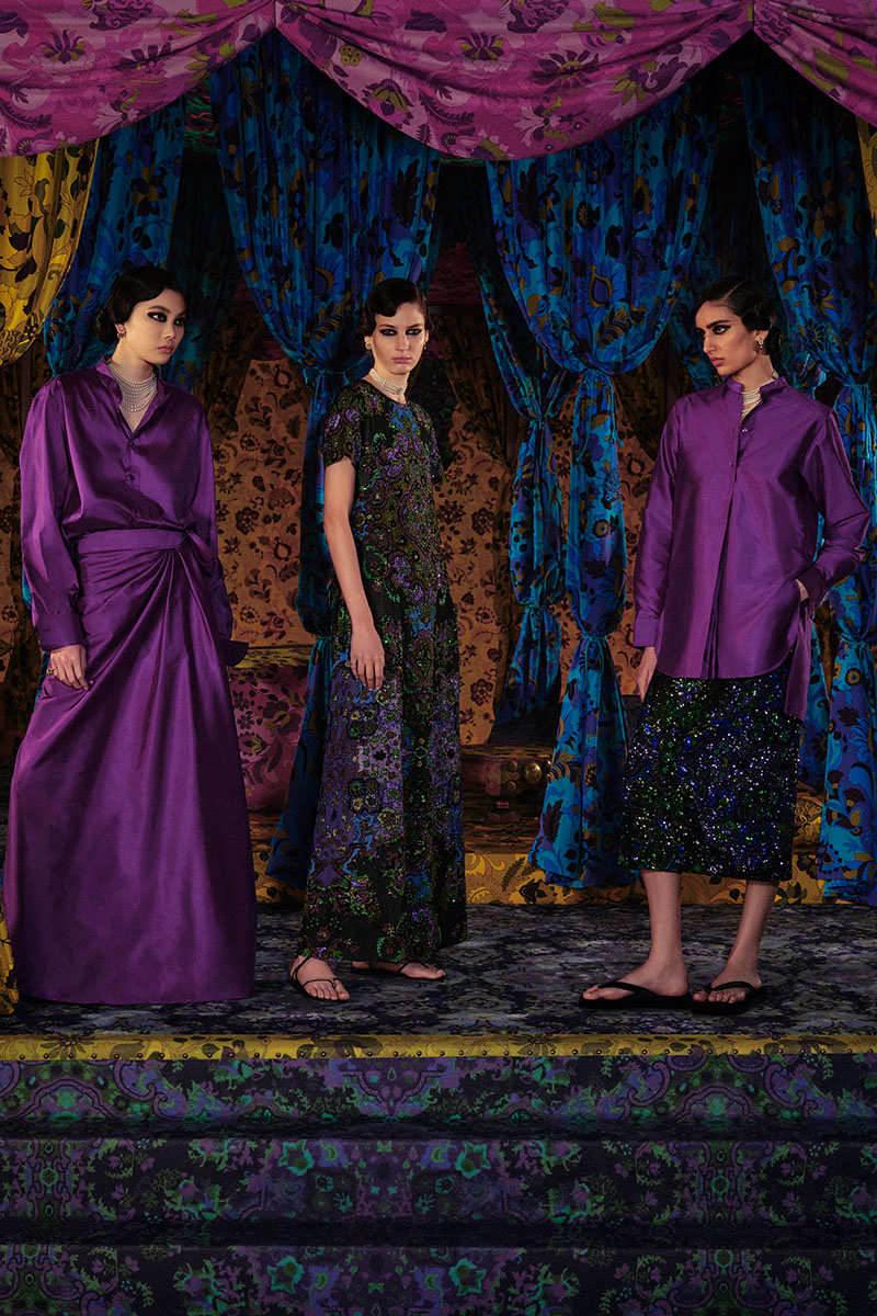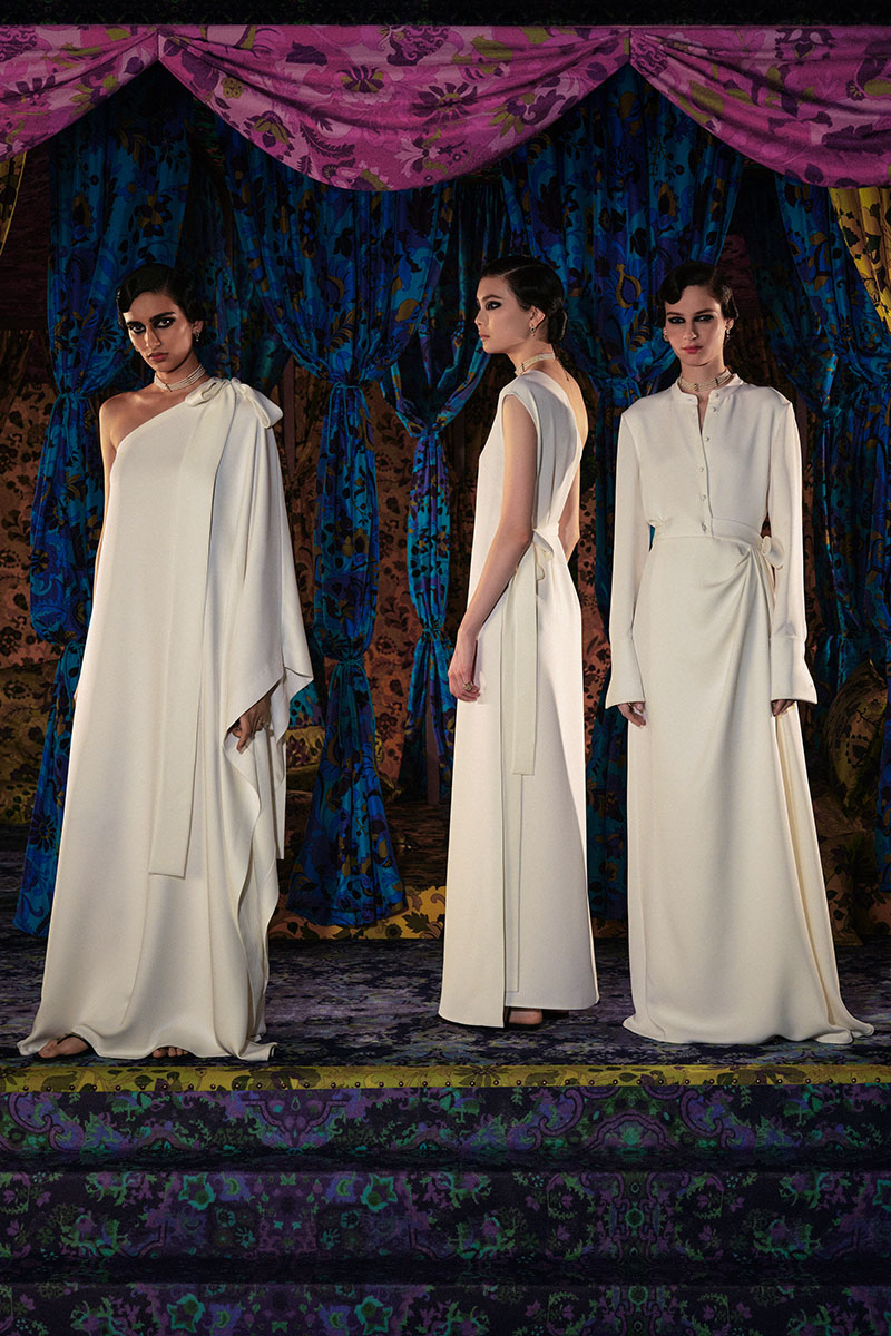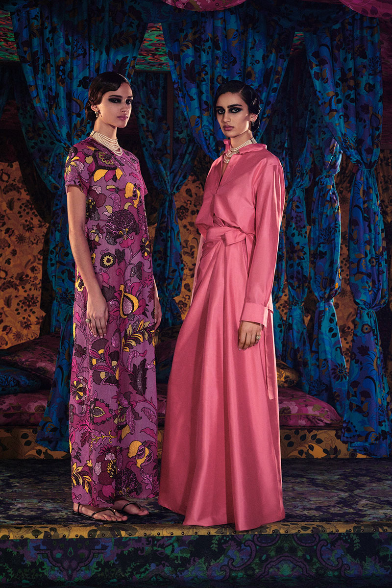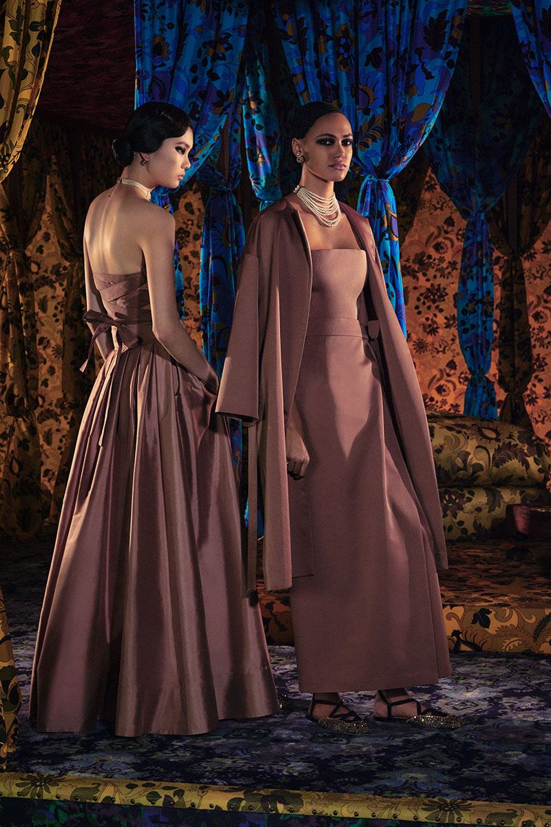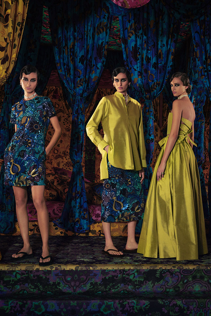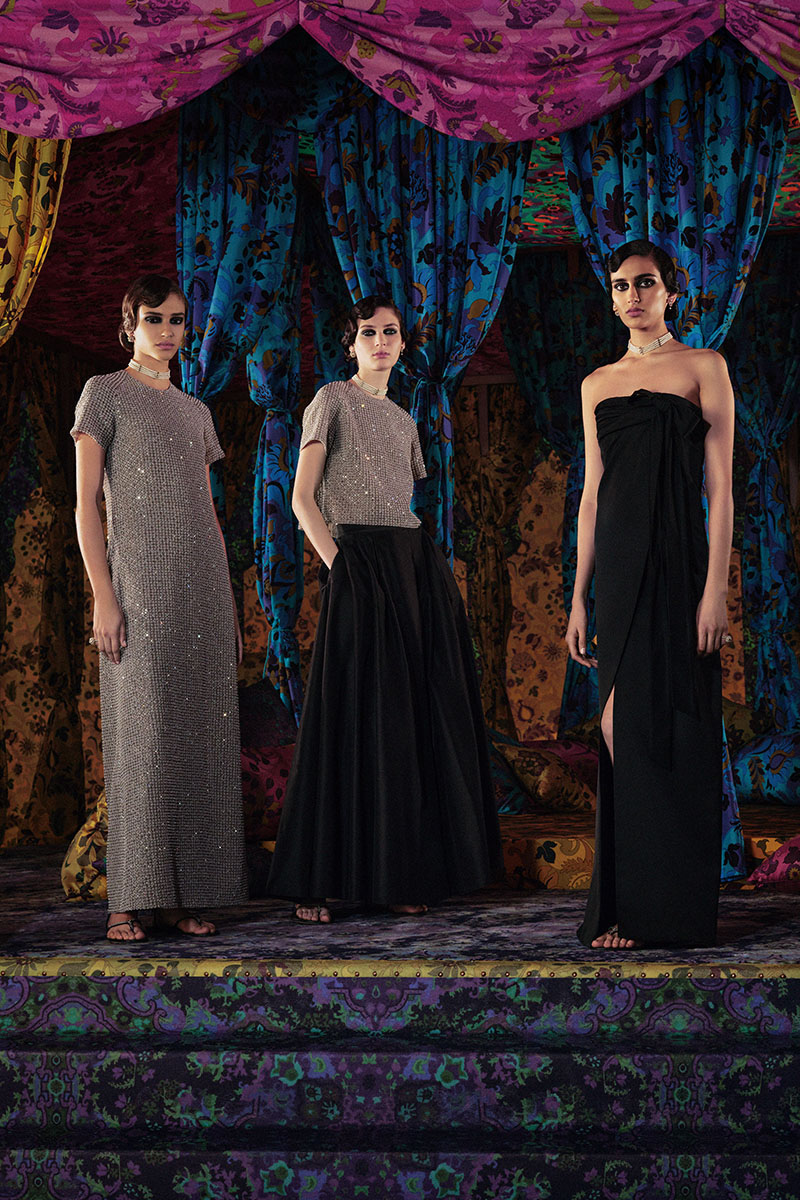 Ahora Maria Grazia Chiuri revisita de nuevo esta fuerte identidad estética escogiendo paletas de colores y materiales que exaltan las influencias compartidas con Karishma Swali. El resultado con formas atemporales en secuencia de bloques de color dedicados a las sedas en tonos verdes, amarillos, rosas y morados.